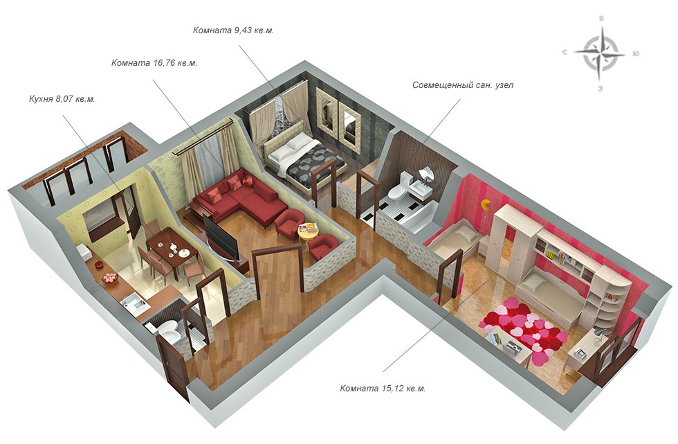 Lorsque deux couples vivent dans une « treshka », la meilleure option serait de laisser deux chambres isolées et un salon commun pour des rassemblements communs. Si la famille a un enfant, alors un, le plus grand en termes de carré, est réservé au salon, le deuxième à la chambre des parents et le troisième à la crèche. Pour un petit enfant, une petite pièce située à côté de la chambre des parents est optimale.