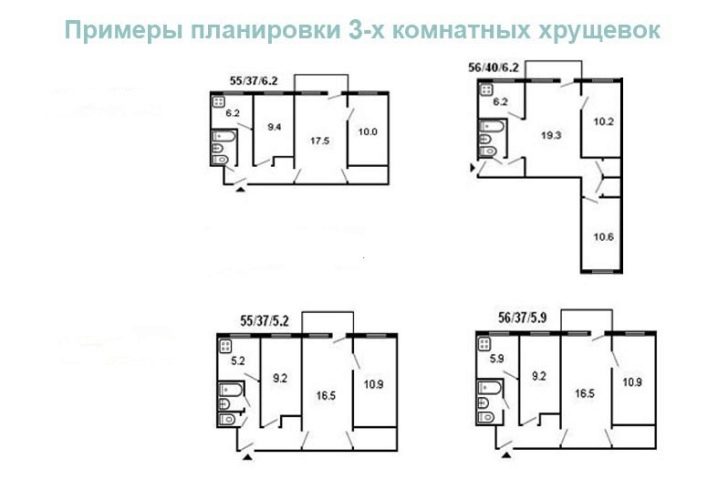 Les premiers "Khrouchtchev" avaient des plafonds bas, des aménagements mal conçus et des pièces exiguës. Les pièces pour ces projets étaient traversantes et contiguës. La plus grande pièce en termes de superficie était située à côté du cellier. Les aménagements des appartements de 3 pièces de ce type présentaient une isolation thermique et phonique des murs insuffisante.