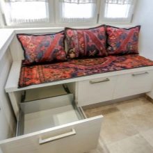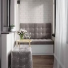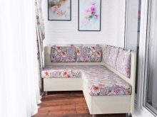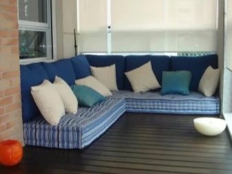 Les canapés encastrables ont le plus souvent une structure corporelle. Ils ressemblent davantage à des systèmes de rangement avec une assise moelleuse et des coussins pour façonner le dos. Parfois, le dessus est fixé au mur comme un panneau. C'est la solution la plus rationnelle qui puisse être placée même sur une petite loggia.