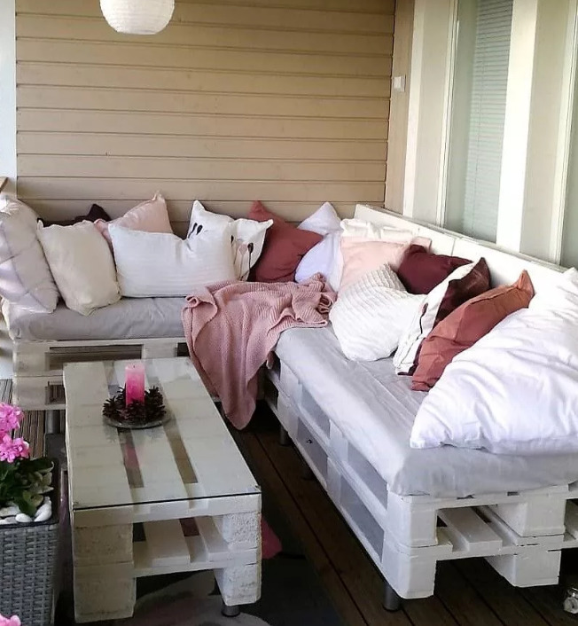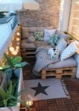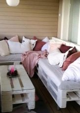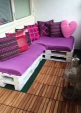 - A partir de palettes. Les canapés palettes peuvent être considérés comme un accessoire de mode pour un loft moderne combiné à un balcon. Le cadre rigide est complété par des oreillers moelleux au plafond. Une palette en bois peut être remplacée par un clin ordinaire, en recueillant la base du futur canapé. Le matériau est en outre traité avec des composés protecteurs et antifongiques, vernis ou teints.