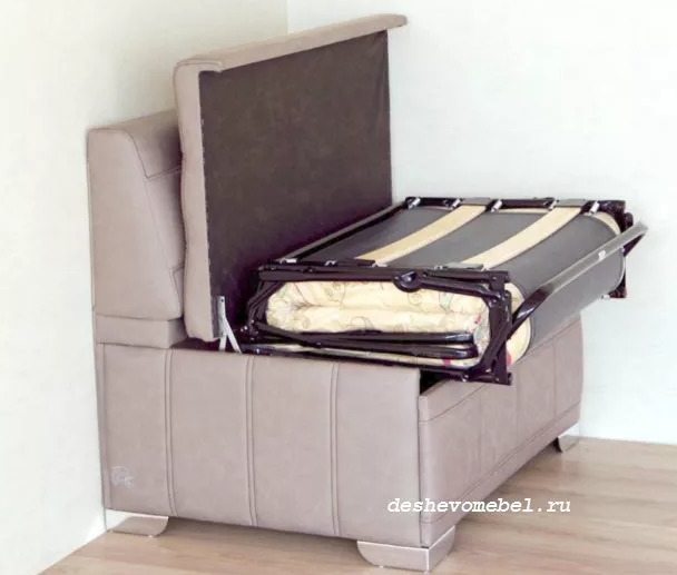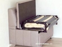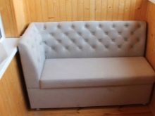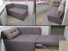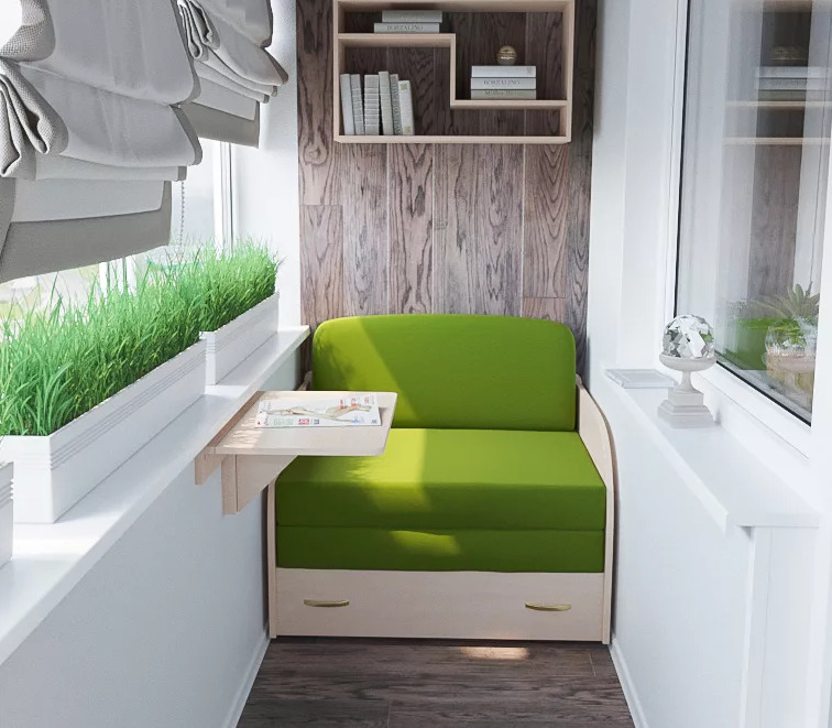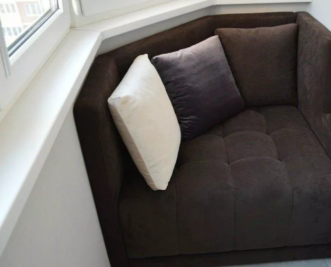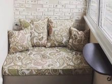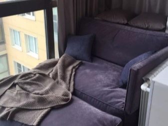 Un canapé-lit avec mécanisme de transformation peut être placé dans une niche sur le balcon spacieux. Le plus souvent, le type roll-out est utilisé ici, dans lequel la couchette est tirée sous le siège de base. Un canapé-lit laconique de type accordéon convient bien aux balcons rectangulaires - il se déplie vers l'avant, en largeur, vous pouvez trouver des options de 1 à 1,6 m pour 2 personnes.