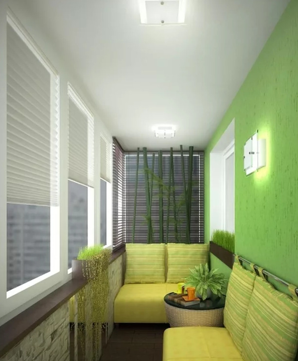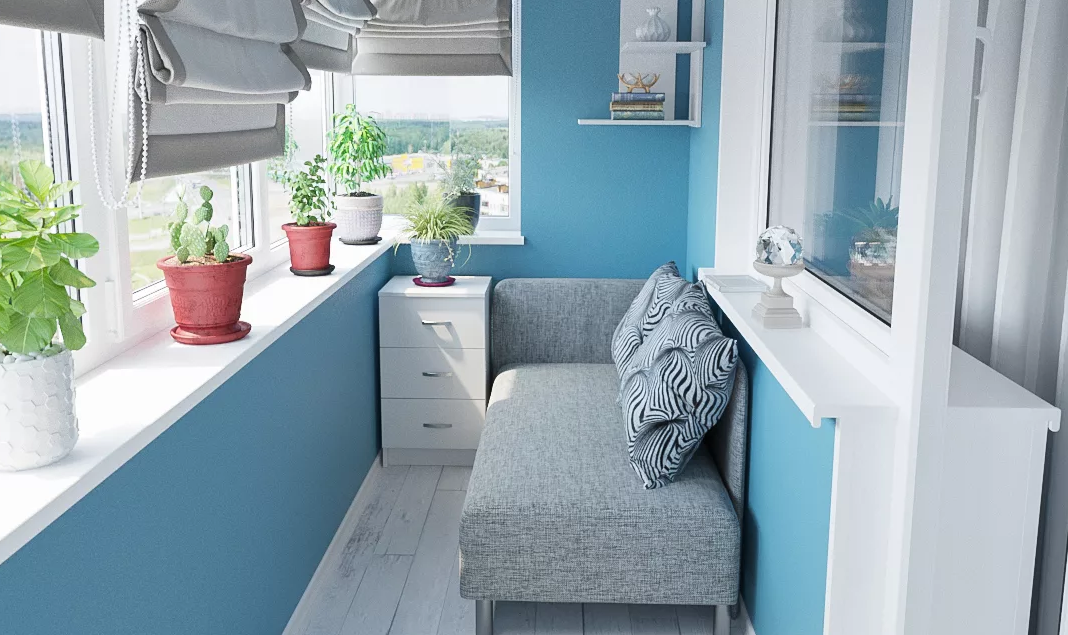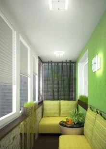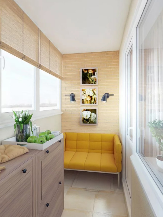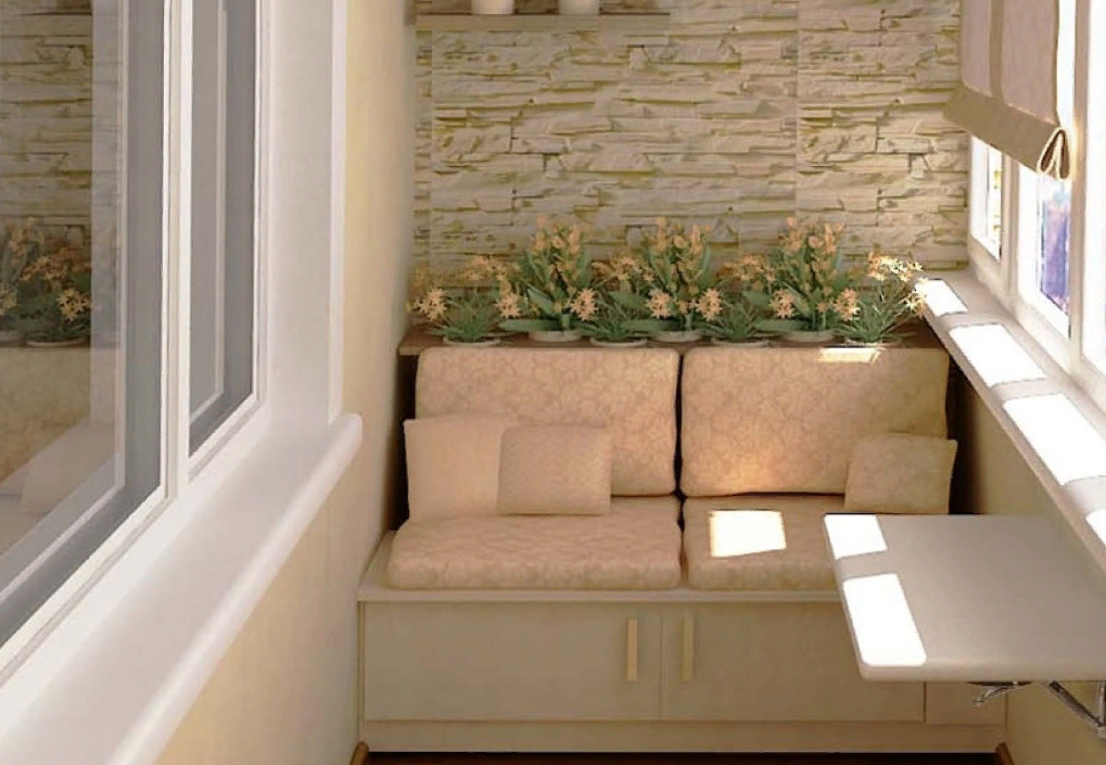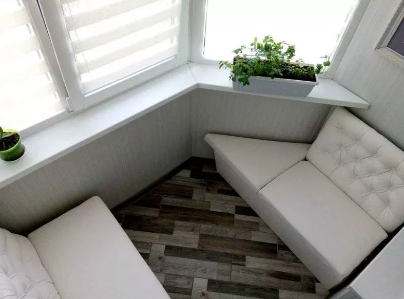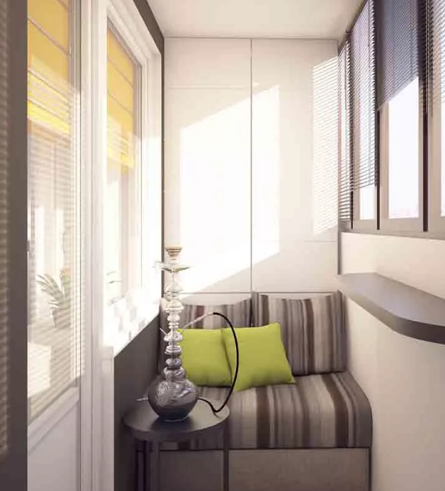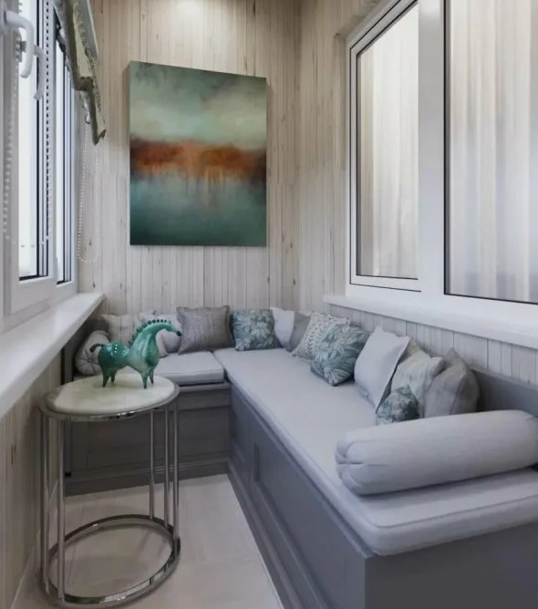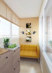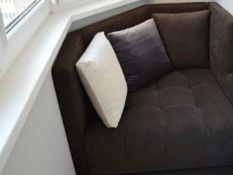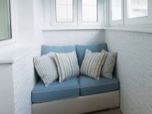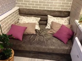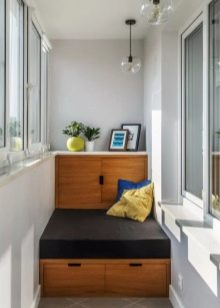 Sur une loggia étroite, un canapé compact est placé contre l'un des petits murs. Il est également possible d'utiliser des modèles encastrables pliants ou compacts. Un balcon de forme complexe vous permet de placer le canapé dans le coin avec la face avant de la pièce adjacente. Les "livres", qui se déplient sur le côté, sont placés le long du long mur.