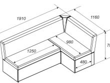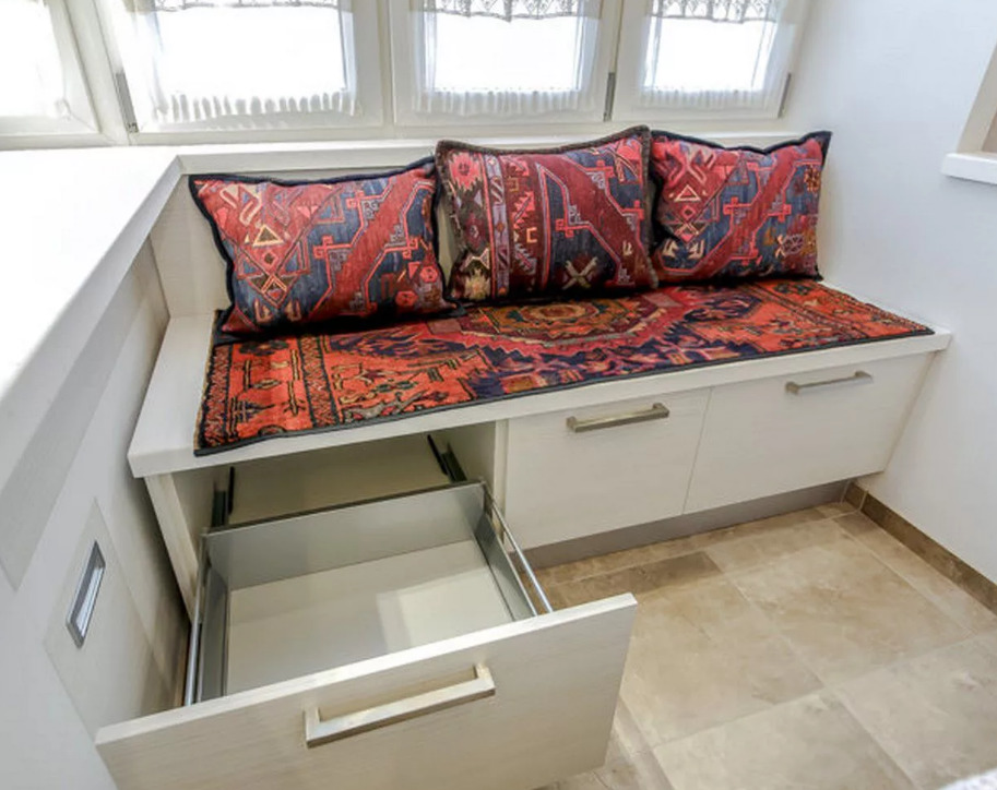 - Un petit balcon de forme complexe avec un bord biseauté et une longueur de côtés de 115 et 110 cm accueillera un coffre de canapé d'angle encastrable sans mécanisme de pliage.