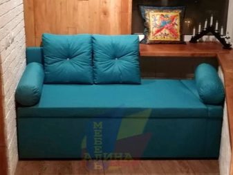 Ce type de canapé pour l'espace balcon peut être à la fois intégré et attaché ou sur roues. Dans un petit espace d'une loggia, il peut être installé de manière à utiliser tous les compteurs gratuits de la manière la plus rationnelle. Les canapés pliants sont le plus souvent choisis avec un élément transformant, ils peuvent avoir des coins gauche et droit. Ils sont fabriqués hors standard, nettement déjà conventionnels, même dépliés, la couchette sera conçue pour 1 personne. Parfois, le module supplémentaire est coulissant, l'utilisant comme table ou bordure pendant la journée, et pendant le sommeil, le déplaçant vers le bloc principal.