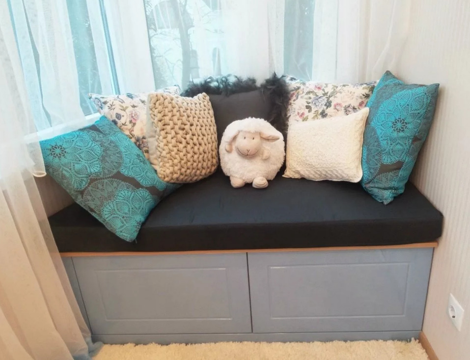- La fonctionnalité d'un meuble. Il ne peut être utilisé que pour le repos assis à court terme. Dans ce cas, vous pouvez choisir des modèles simples avec un cadre en bois, en plastique, en rotin et des oreillers moelleux. Pour bien dormir, il vous faudra décrocher un canapé transformable. Le système de rangement à l'intérieur peut être représenté par une boîte pour le linge ou des sections coulissantes.