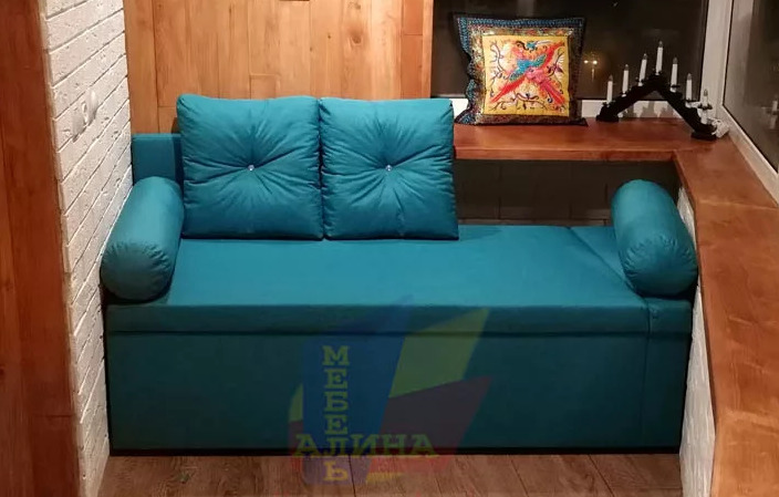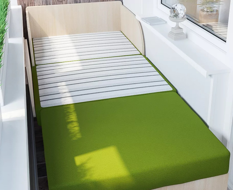 - Un petit canapé pliant peut être installé sur un balcon rectangulaire étroit de 115 à 120 cm de large.Il est important que sa largeur soit inférieure de 50 à 100 mm aux paramètres principaux. Un canapé-lit ou un canapé accordéon de 110 cm d'une longueur allant jusqu'à 1,6-2 m conviendra ici.Vous pourrez aménager un couchage pour un enfant ou un adolescent.