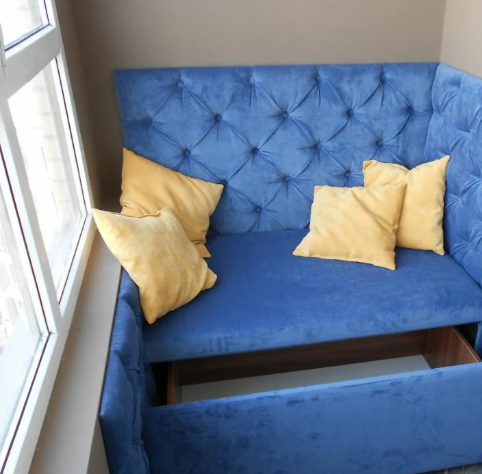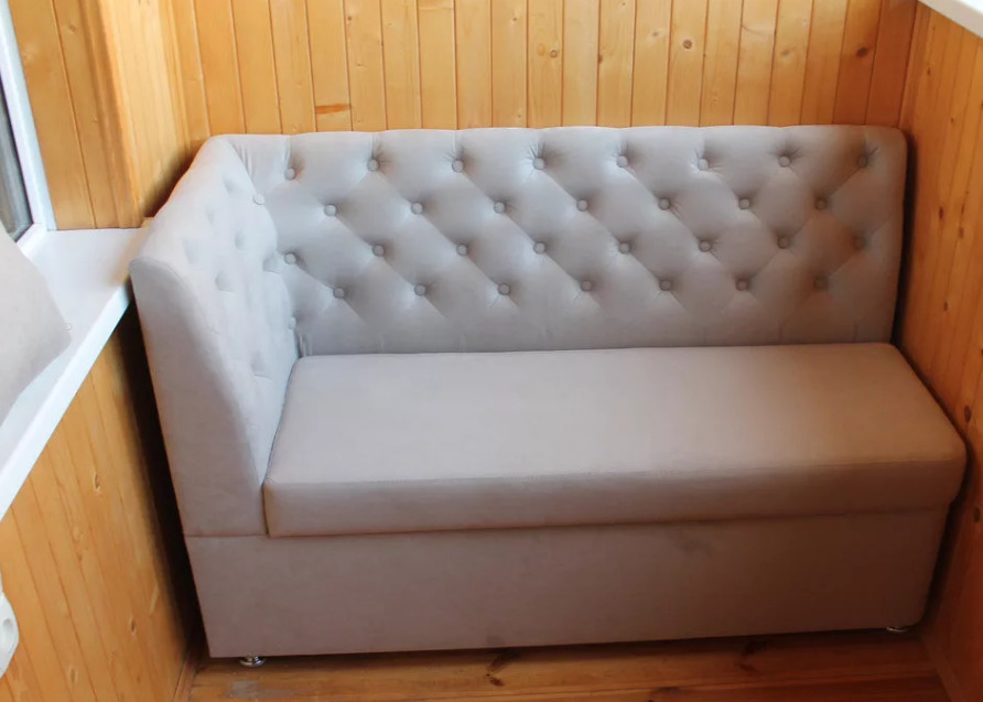Un canapé de balcon peut radicalement différer du format habituel des meubles rembourrés. De tels meubles sont fabriqués avec une structure en métal ou en bois, les modèles peu coûteux peuvent avoir une base en aggloméré ou en MDF. Le rembourrage est en caoutchouc mousse ou fourni avec un mécanisme à ressort avec holofibre, rembourrage en polyester. Les modèles chers utilisent des matériaux naturels tels que le crin de cheval. Les structures souples sans cadre sont remplies de cosse de sarrasin, de billes de polymère ou de mousse à mémoire de forme.