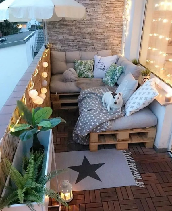 - Coffre de canapé laconique aux couleurs pastel a l'air élégant sur un balcon léger dans un style classique. Animez la composition des plantes en pots, ainsi que des plots compacts. Le canapé est complété par une table pliante miniature et un store enrouleur assorti.