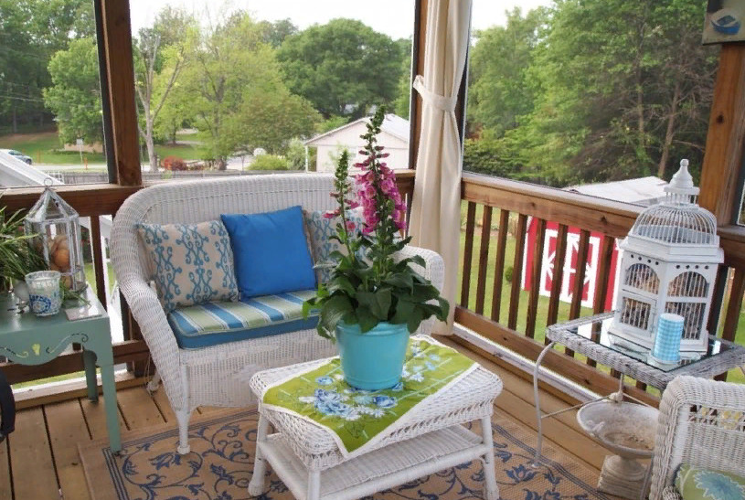 - Balcon spacieux dans une maison de campagne - une excellente solution pour des vacances en famille. Le parquet et les balustrades en bois classiques sont complétés par une paire de canapés en osier et une table d'appoint dans le même style. Des rideaux de lin volants, une cage à oiseaux et des plantes dans des pots de fleurs sont responsables de la création de l'esthétique coloniale.