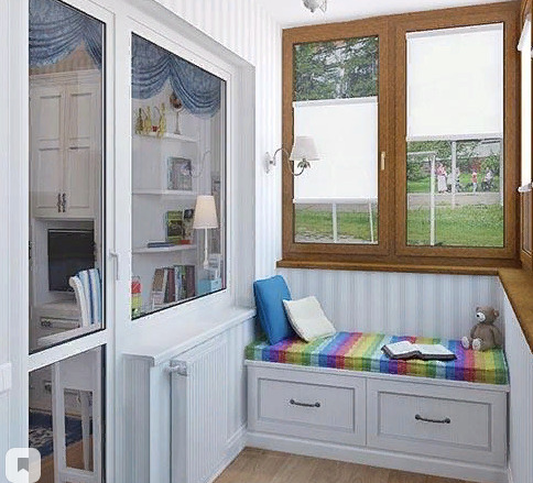 - Il est assez simple d'aménager un espace détente pour enfants sur un balcon moderne. Il suffit de fabriquer la base sous la forme d'une commode avec des tiroirs pour jouets, puis de la compléter avec un tapis lumineux dans une housse en textile et des coussins colorés.
