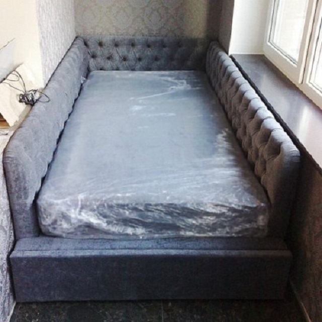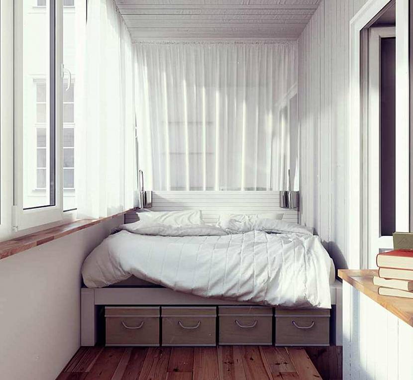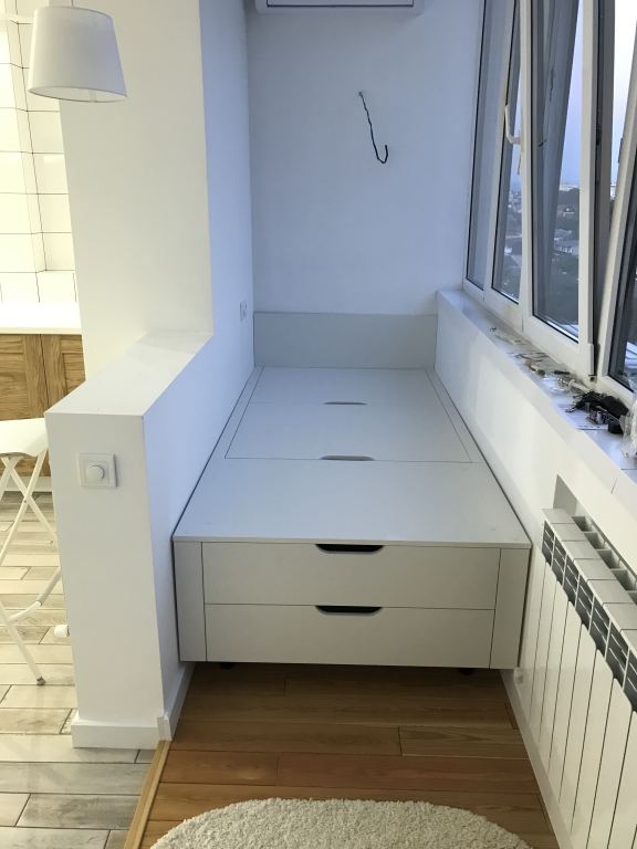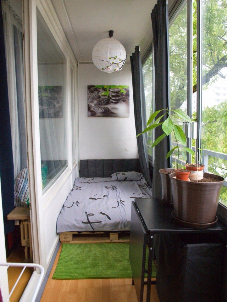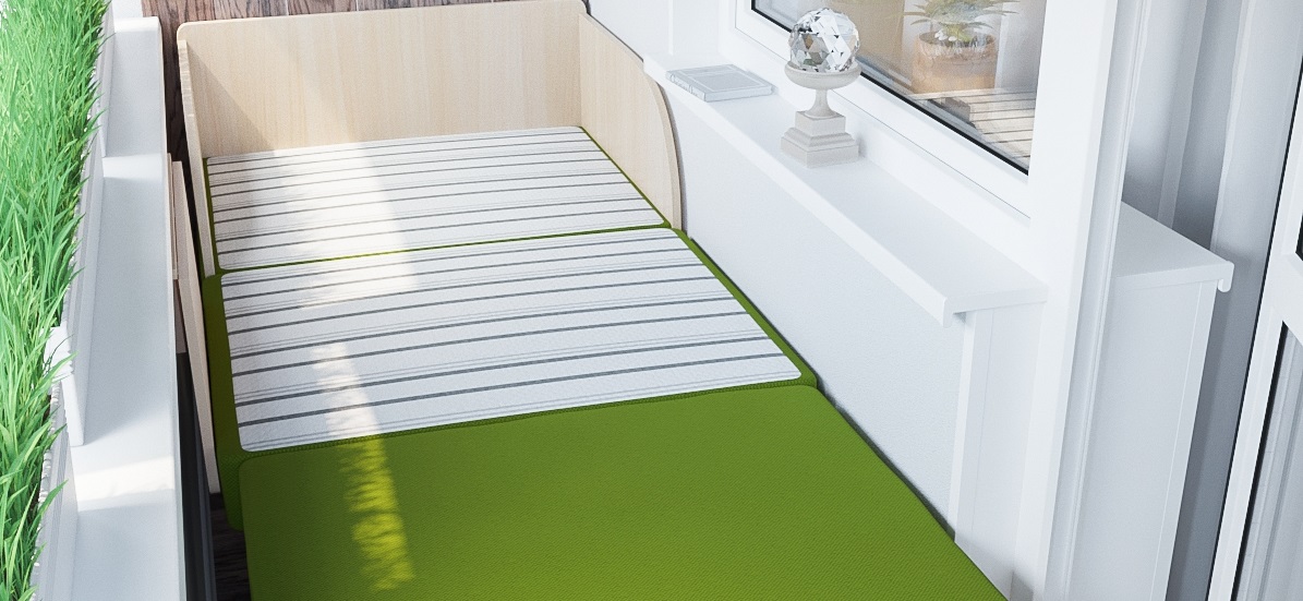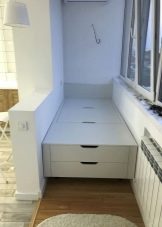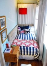 Un balcon étroit - par exemple, d'une superficie totale de 3 m2 - est susceptible d'être occupé aux 2/3 en raison de la couchette... Même lorsque le lieu de couchage est équipé temporairement - par exemple, à l'aide d'un matelas pneumatique ou ordinaire, la disposition de la chambre improvisée sur le balcon sera la même.