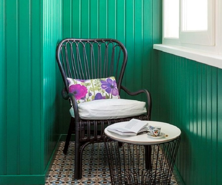 - Doublure verte, verticale, très agréable, et même en combinaison avec ce joli carrelage au sol, créez un espace incroyablement confortable. La meilleure façon d'échapper à l'absence de visage du balcon est cette conception.