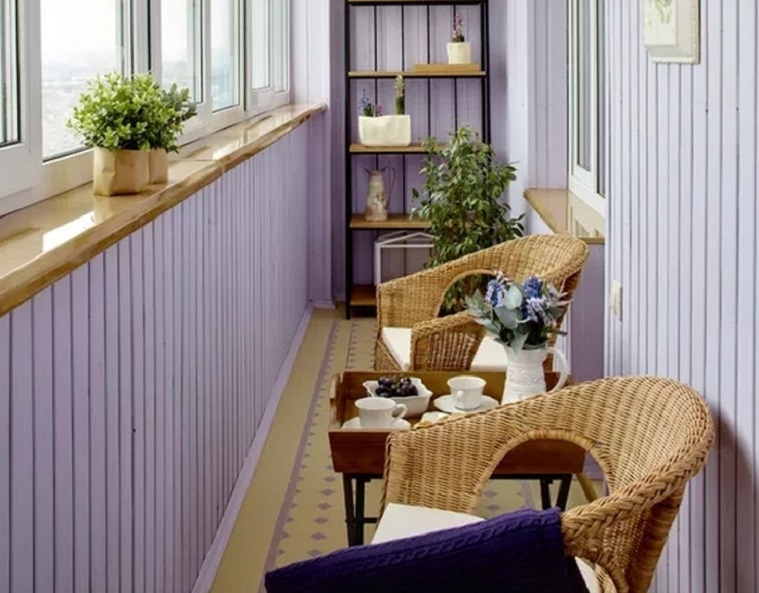 - Dans ce cas, les propriétaires ont préféré un violet terne, et il s'est parfaitement installé sur un balcon étroit, plongeant l'espace dans sa tendresse et sa détente. Et c'est tout de même la même doublure, et un balcon tout à fait typique.
