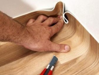 - Un morceau de linoléum de la longueur et de la largeur requises est découpé. Pour couper, vous aurez besoin d'une surface plane et plate et d'un couteau de construction. Vous pouvez également utiliser des ciseaux pour le métal.