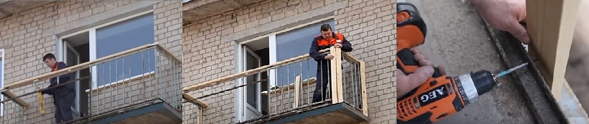 La barre horizontale est montée sur la dalle du balcon avec des coins métalliques et des chevilles. Les barres sont fixées les unes aux autres à l'aide de vis autotaraudeuses.
