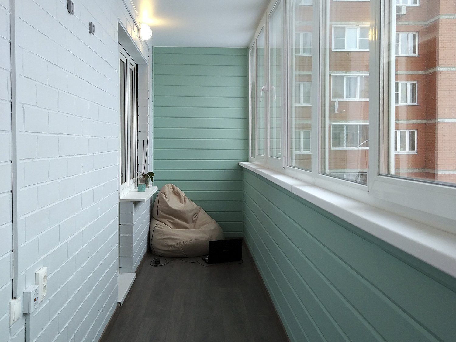 Dans le monde moderne, le balcon peut également être utilisé comme bureau; pour ce type de pièce, vous pouvez utiliser des nuances de peinture grisâtres pour la doublure, qui ne fatigueraient pas vos yeux, comme le blanc, mais en même temps étaient calmes et chaleureux. Il existe de nombreuses applications du balcon, tout dépend des besoins de la personne, mais la finition avec des planches à clin est une option gagnant-gagnant.