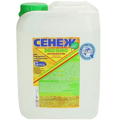 - "Senezh Ecobio" - avec cet antiseptique économique incolore, ils protègent le bois de la moisissure, le protègent de manière fiable du bleu, de la pourriture et des attaques d'insectes. Il est en fait utilisé uniquement pour le travail interne. Il se caractérise par une perméabilité élevée, d'excellentes propriétés fongicides, la préservation de la structure "respiration" du bois, ainsi qu'une capacité particulièrement précieuse à arrêter les dommages au bois déjà apparus.