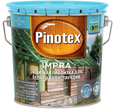 - Pinotex Impra - le liquide pour travaux intérieurs est fabriqué à base d'eau, contient plusieurs additifs très concentrés qui empêchent le bois de succomber à la moisissure, à la pourriture et au bleu. Ce produit se distingue par une capacité de pénétration élevée, une résistance à l'humidité sûre, un manque d'odeur en principe et des propriétés fongicides prononcées. Si la température a atteint +5 et que l'humidité ambiante est de 80%, vous pouvez traiter le revêtement avec cet outil. Vous devez d'abord bien mélanger, appliquer la première couche avec un pinceau, la sécher pendant au moins 3 heures et appliquer la deuxième couche.