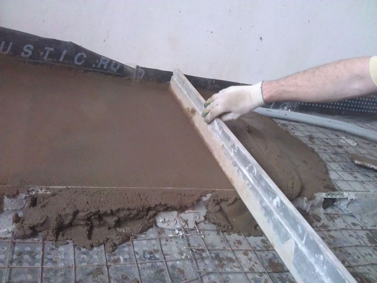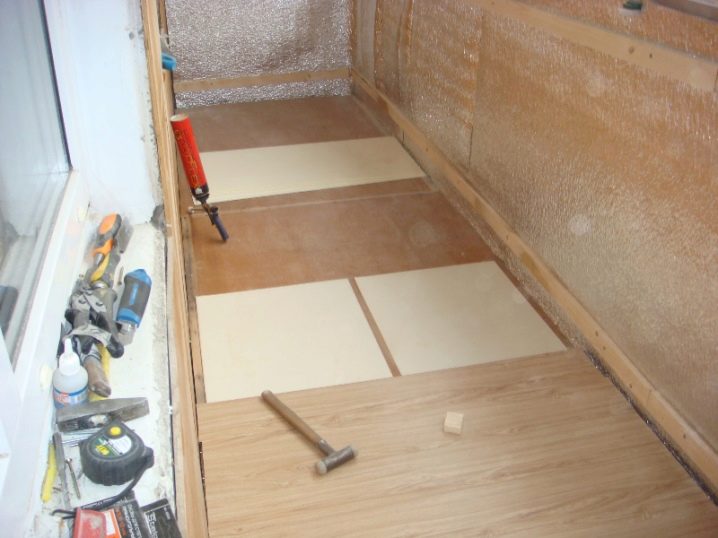 Habituellement, le sol est nivelé avec des mélanges spéciaux. Cette étape de la pose est mieux confiée à un spécialiste, surtout si la réparation de la loggia est tombée sur la saison froide, car l'eau du mélange peut geler. Pour éviter cela, la solution doit être diluée avec des additifs spéciaux.