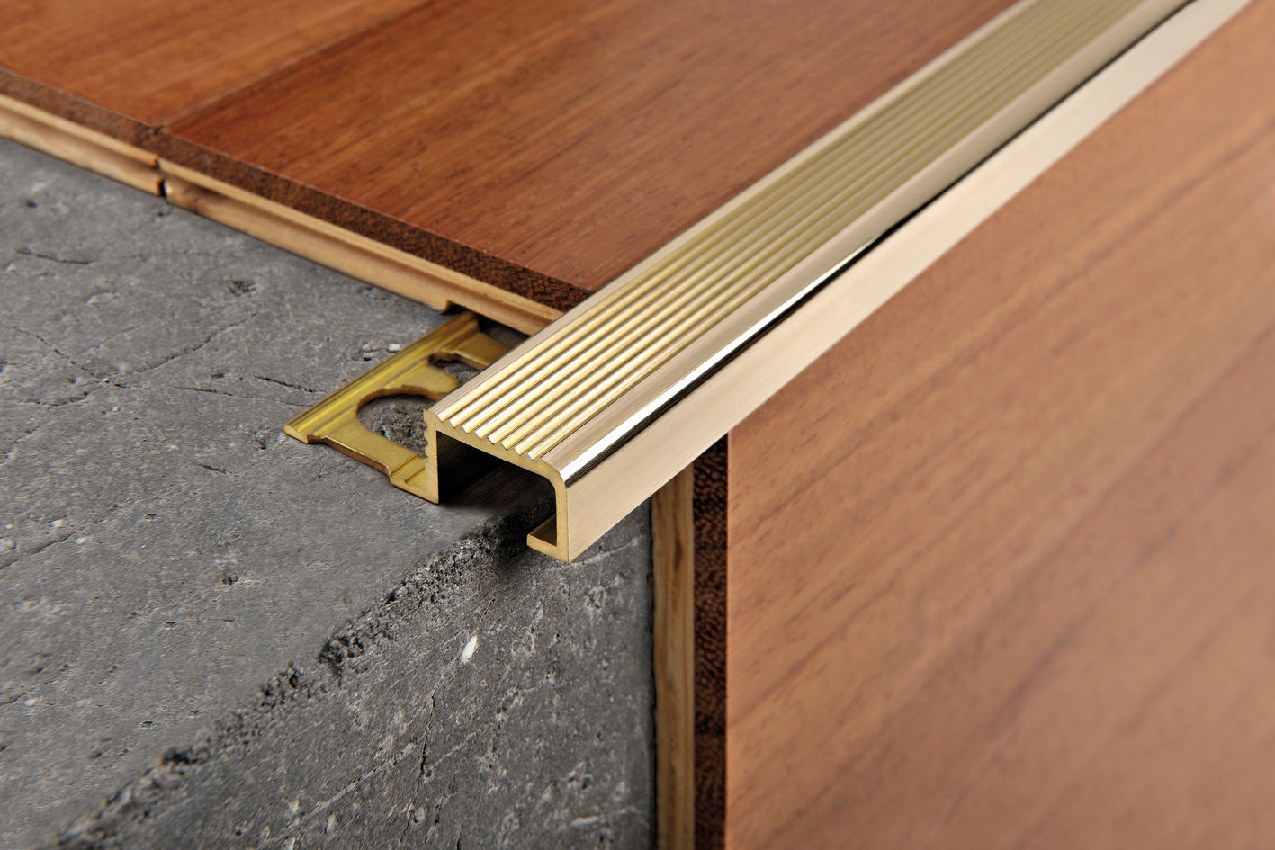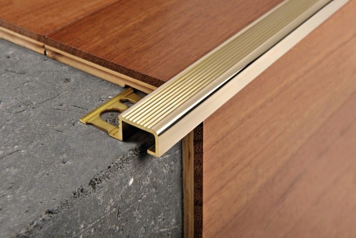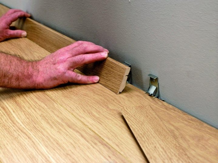 À la fin de l'installation du stratifié, les seuils et les plinthes sont installés. C'est la dernière étape de la finition. En plus des plinthes elles-mêmes, vous devez immédiatement acheter des raccords de la même couleur et du même fabricant - coins internes et externes, fiches, connecteurs.