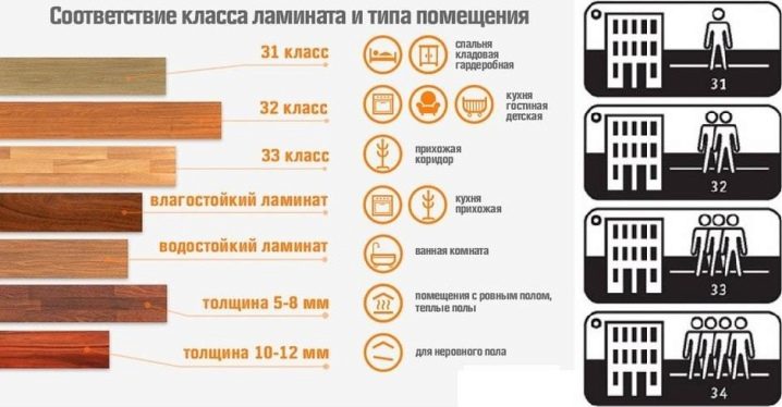 Commençons par la classe. La classe du stratifié caractérise principalement la perméabilité de la pièce à laquelle il est destiné. Maintenant, le plus souvent, vous pouvez rencontrer des classes de stratifiés commerciaux, les ménages sont de moins en moins courants.
