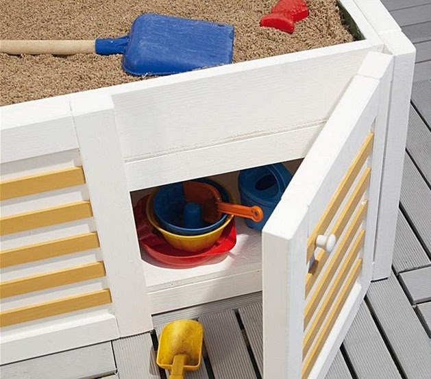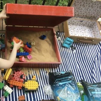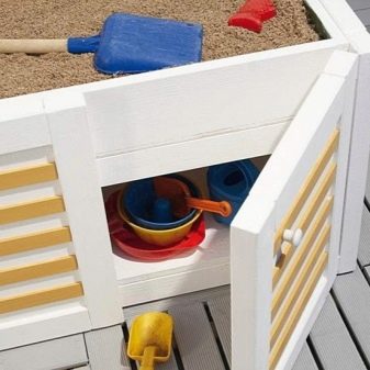 - avec une organisation correcte de l'aire de jeu, le bac à sable peut être utilisé non seulement pour l'usage auquel il est destiné, mais également comme rangement pour les jouets, une table.