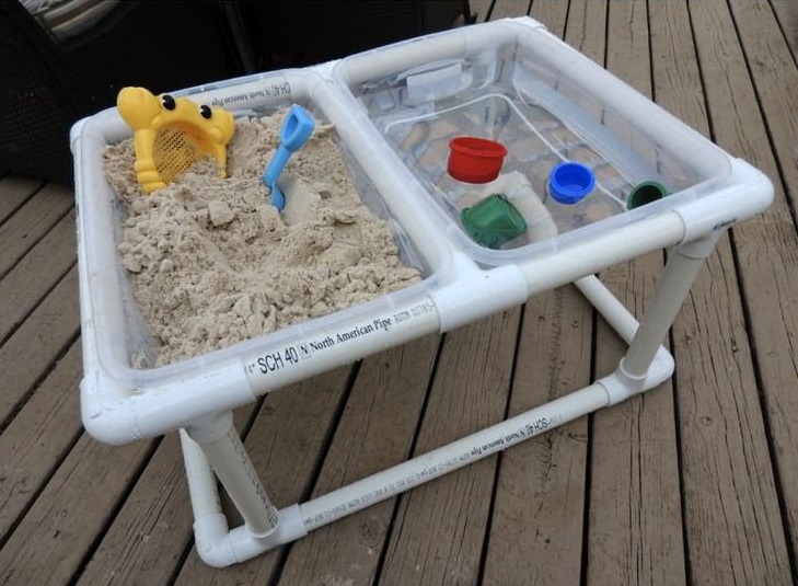 C'est beaucoup plus pratique lorsque le bac à sable est sur pieds - l'enfant peut alors jouer debout ou s'asseoir à côté de lui sur n'importe quelle chaise appropriée. L'option la plus simple consiste à assembler un cadre à partir de barres qui maintiendront les conteneurs. Les roulettes à pattes rendront la structure plus mobile, et les crochets et les paniers d'accessoires vous aideront à garder tout ce dont vous avez besoin au même endroit.