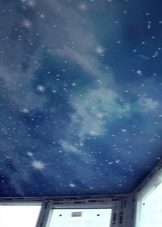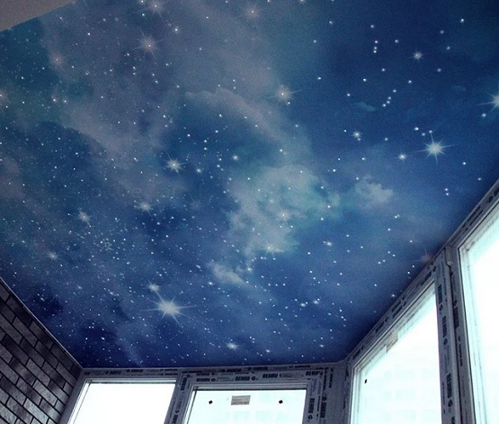 Bien sûr, un plafond blanchi à la chaux est hors de question. La seule exception est le style provençal. Dans cette version, il est complété par des poutres en bois. Dans tous les autres cas, vous devez vous concentrer sur les plafonds tendus modernes. Des tirages originaux peuvent être imprimés sur la toile.