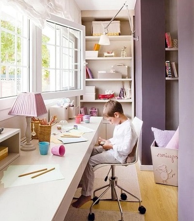 Les enfants actifs et joyeux ne seront heureux que si on leur offre un mur suédois. Au lieu d'un bureau, vous pouvez utiliser une partie du rebord de la fenêtre. Les chaises doivent être ajustées en hauteur en fonction de la taille de ceux qui sont assis derrière elles.
