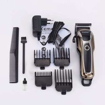 - Kemei-2204, Kemei-2600, Kemei-5027. Un ensemble de deux outils de base et une tondeuse pour coiffer une barbe et une moustache. Le kit comprend un adaptateur de charge et un ensemble d'accessoires détachables.
