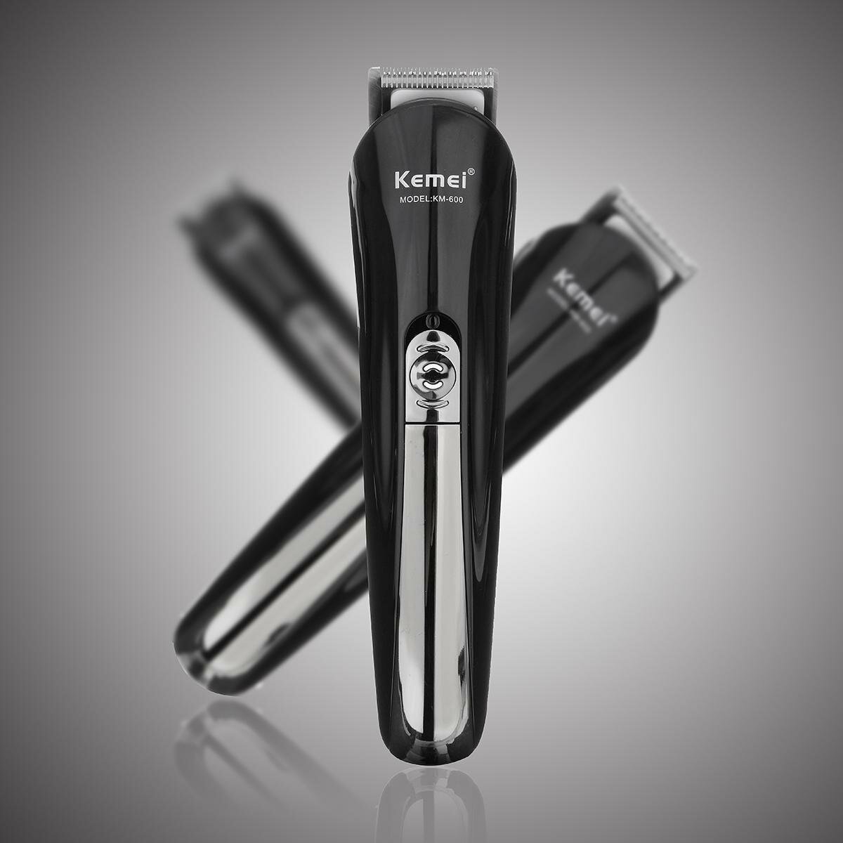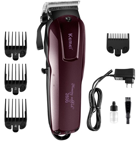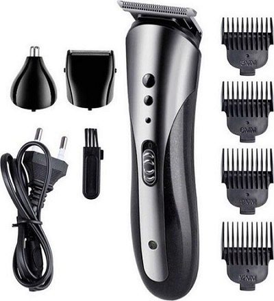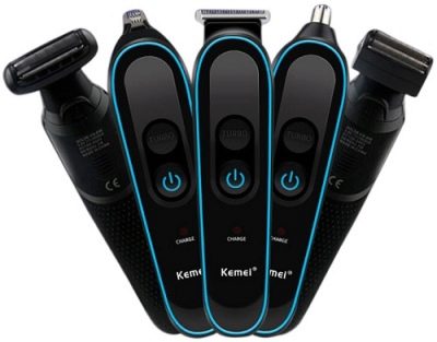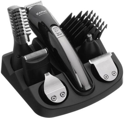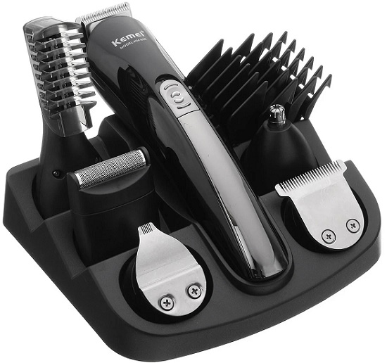 - Kemei-600. L'ensemble se compose de la tondeuse à cheveux la plus électrique avec six têtes différentes et une tondeuse pour façonner la barbe et la moustache. Un adaptateur de charge et 4 accessoires détachables sont également inclus.