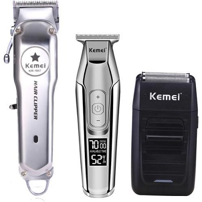 - Kemei-1997, Kemei-1996, Kemei KM-5027, Kemei-1102... L'ensemble de ces modèles est un ensemble composé d'une machine sans fil avec un ensemble d'accessoires, d'une tondeuse hygiénique, d'un rasoir électrique et d'un mini-ensemble pour l'entretien des appareils.