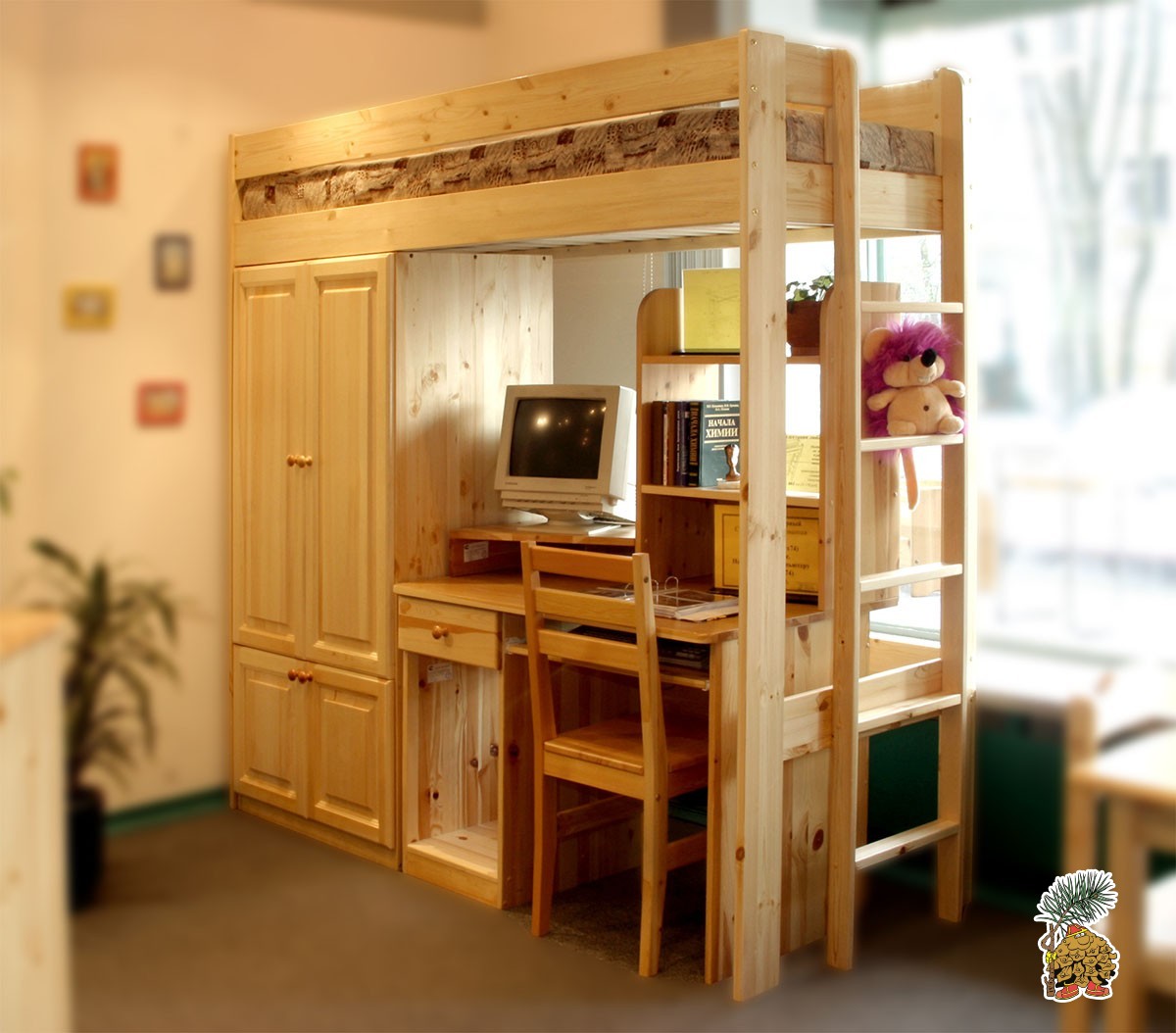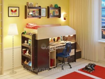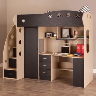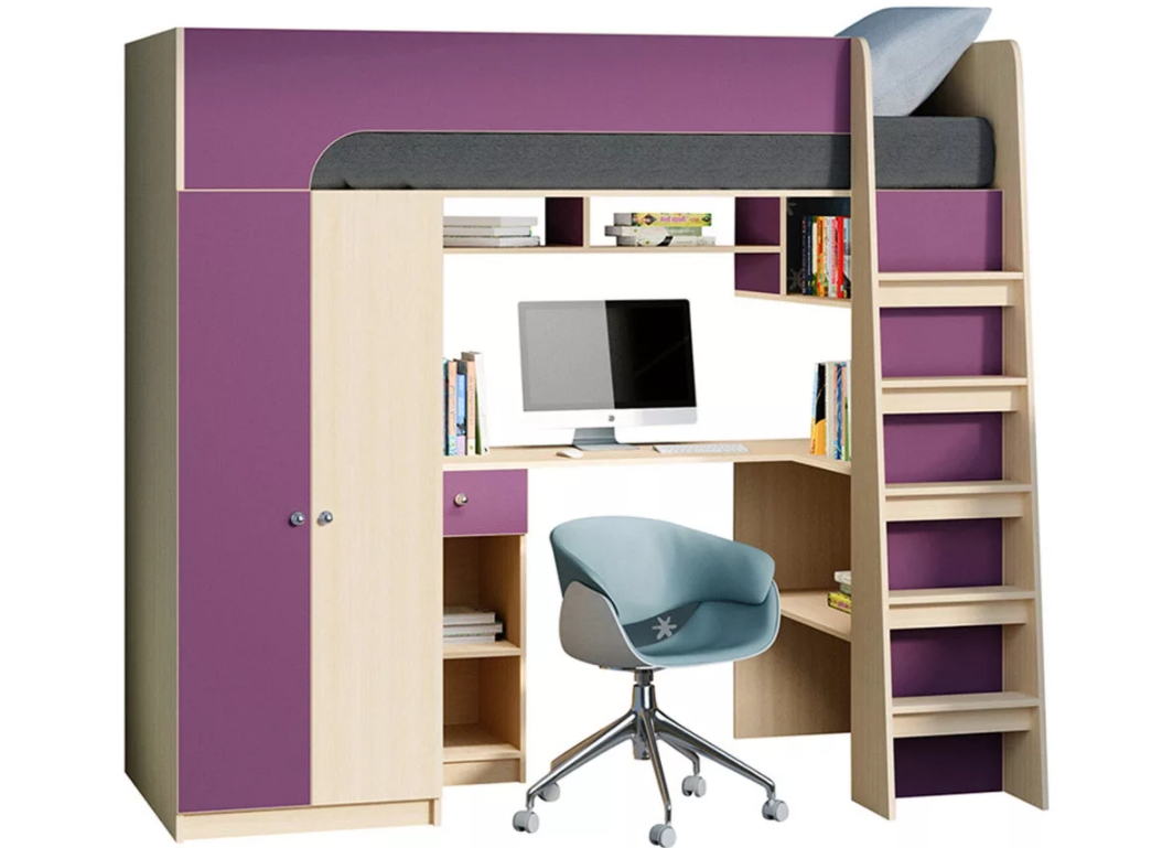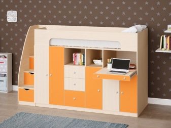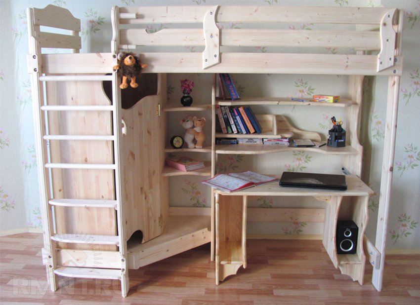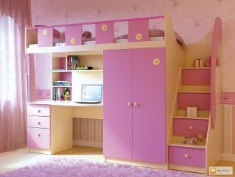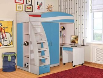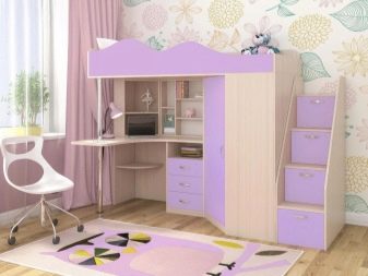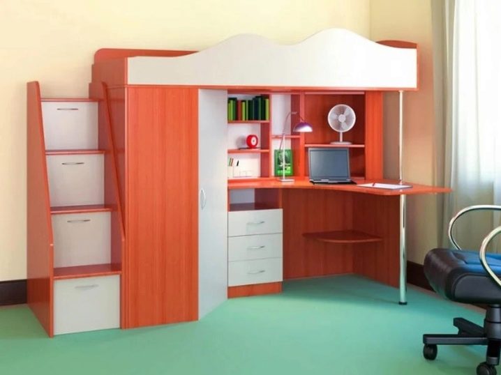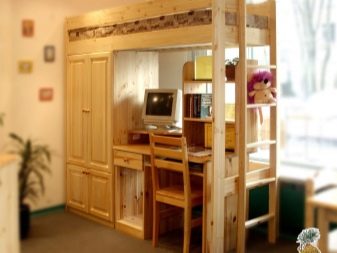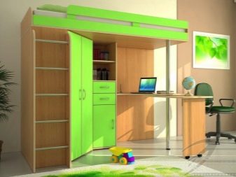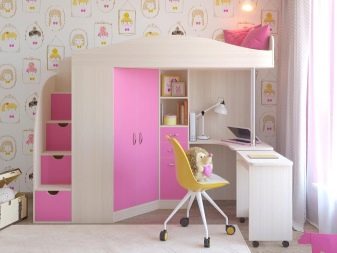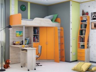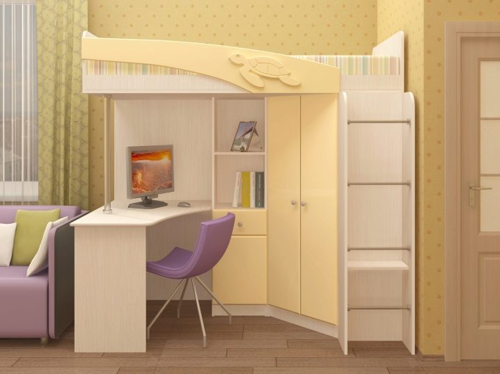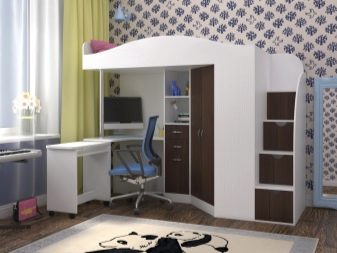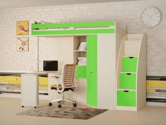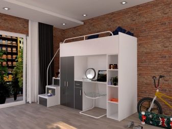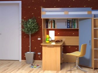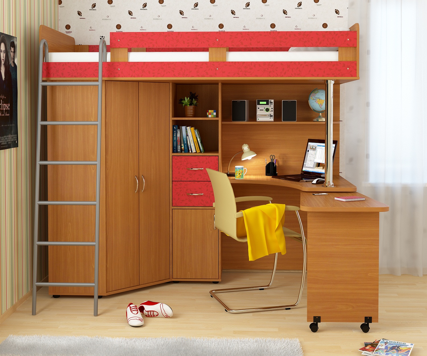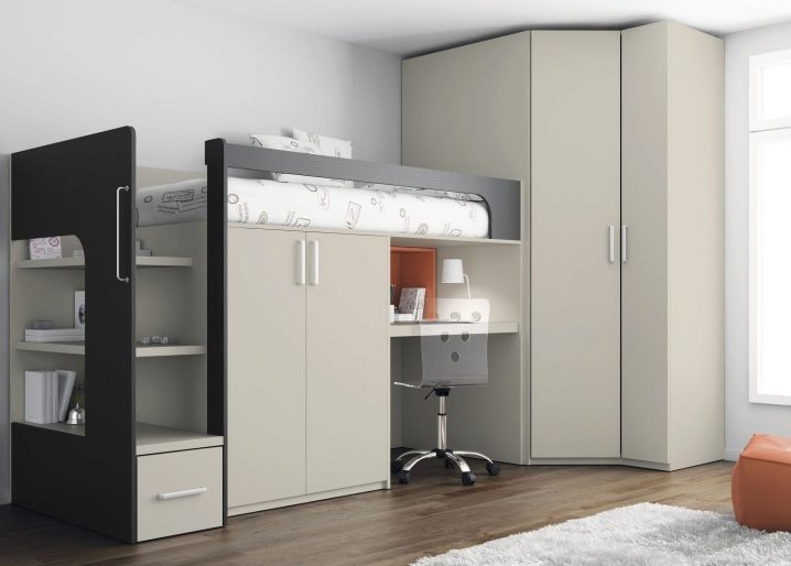 - Avec penderie et table. Cet ensemble de meubles n'a pas de premier niveau standard. Au lieu de cela, une zone de travail est organisée ici. Il offre suffisamment d'espace libre pour un ordinateur personnel, de la littérature, divers ustensiles d'écriture et d'autres choses nécessaires.
