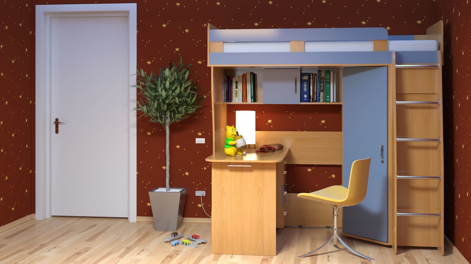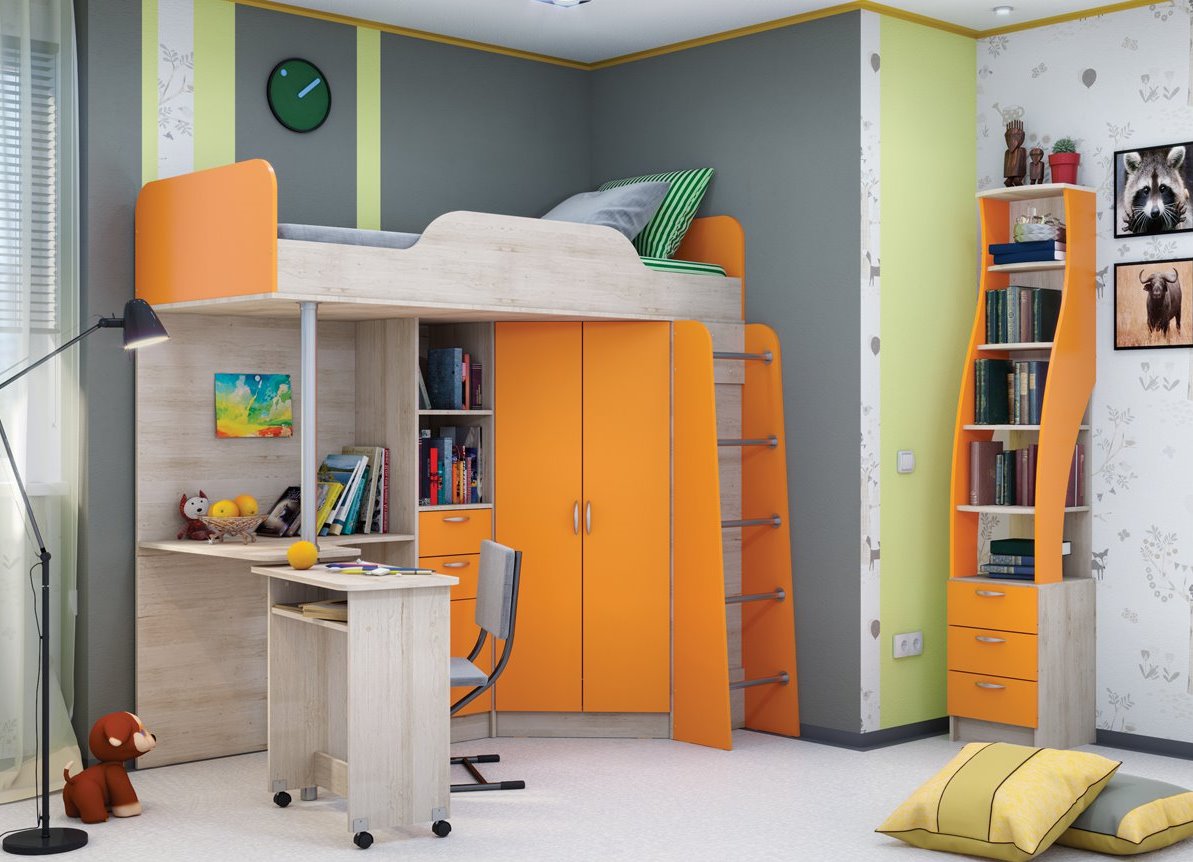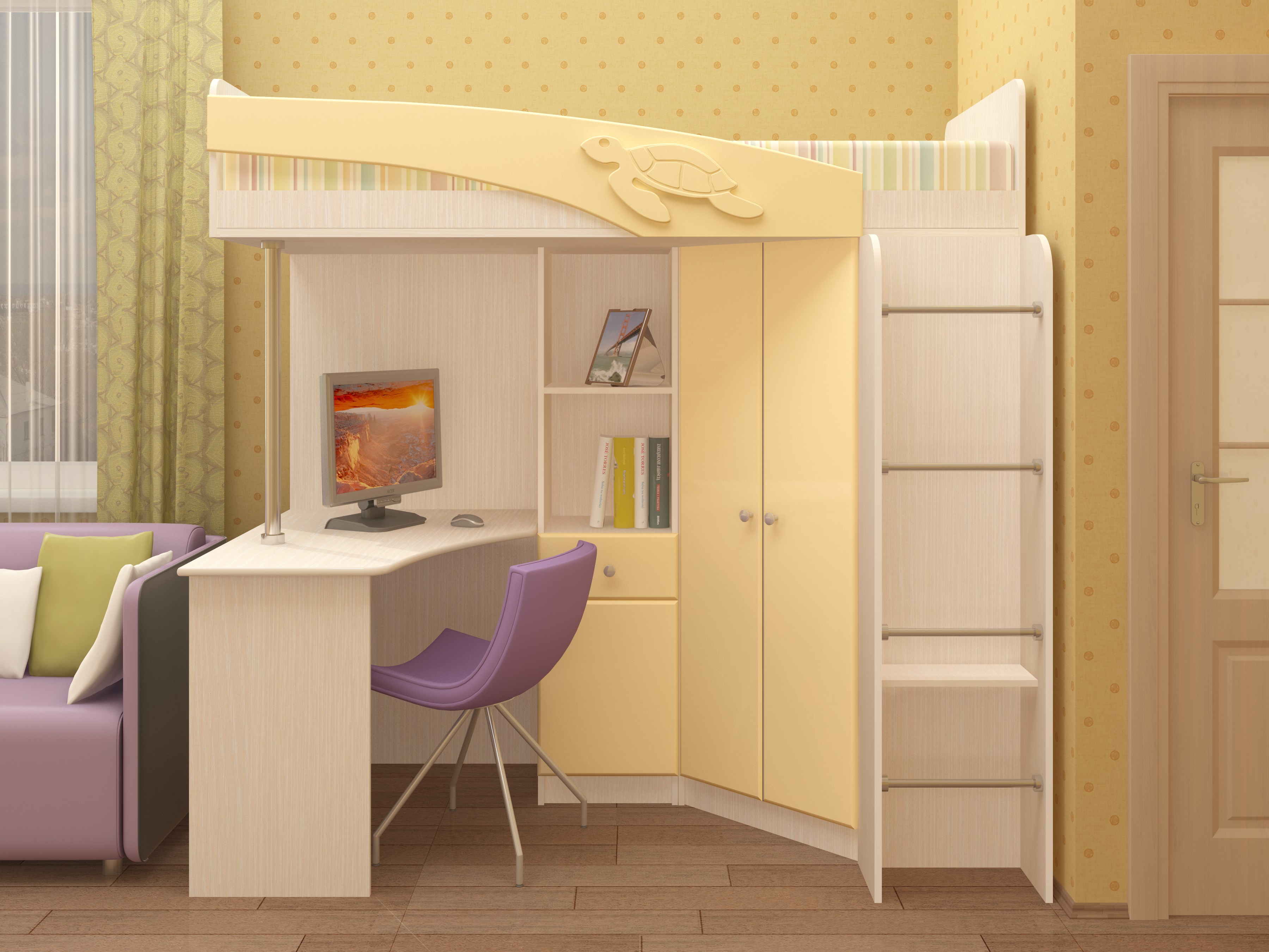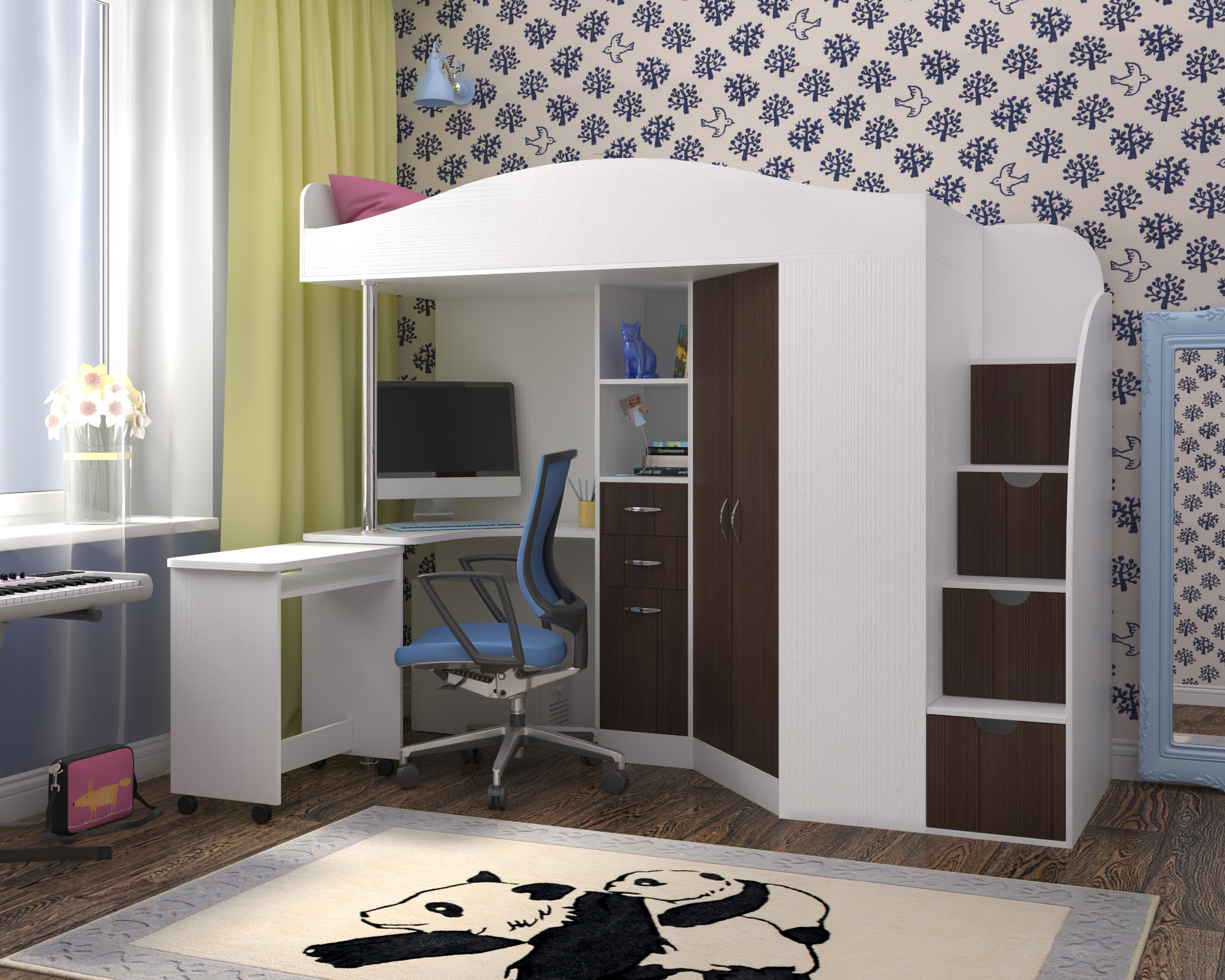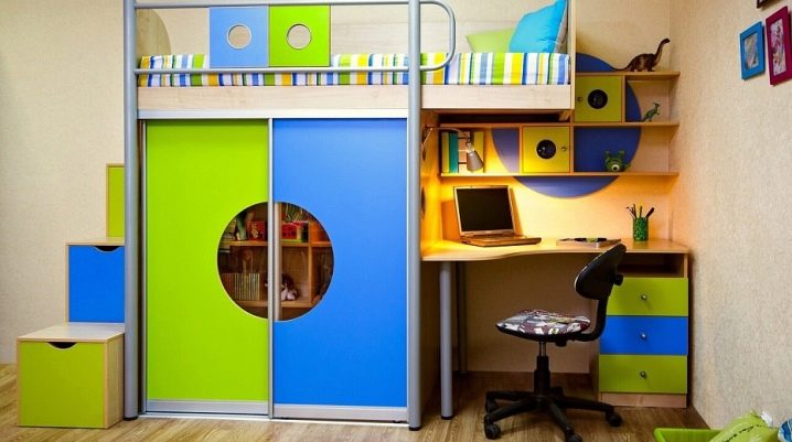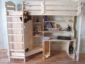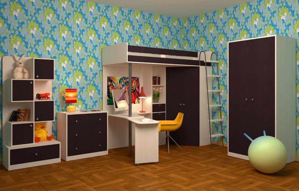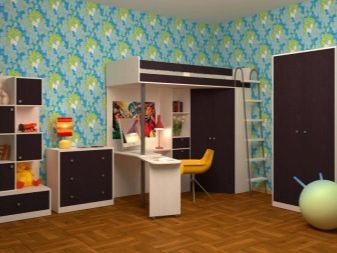 - Avec penderie et table. Cet ensemble de meubles n'a pas de premier niveau standard. Au lieu de cela, une zone de travail est organisée ici. Il offre suffisamment d'espace libre pour un ordinateur personnel, de la littérature, divers ustensiles d'écriture et d'autres choses nécessaires.