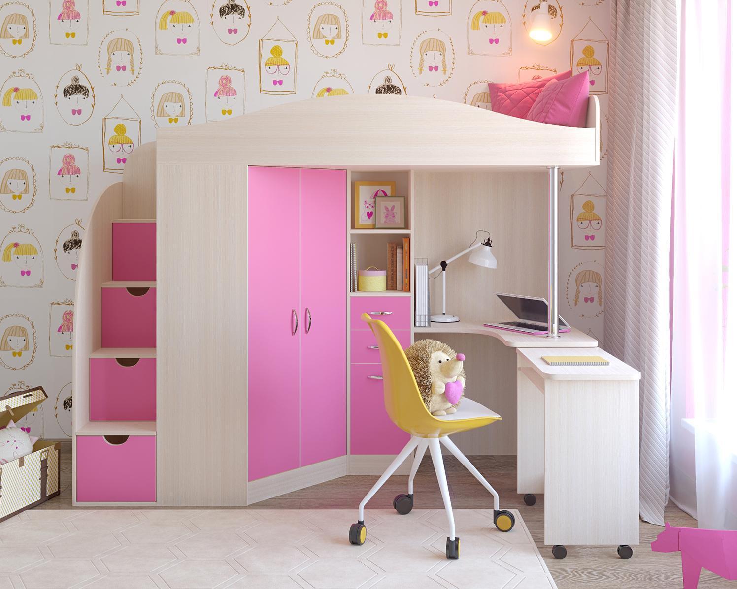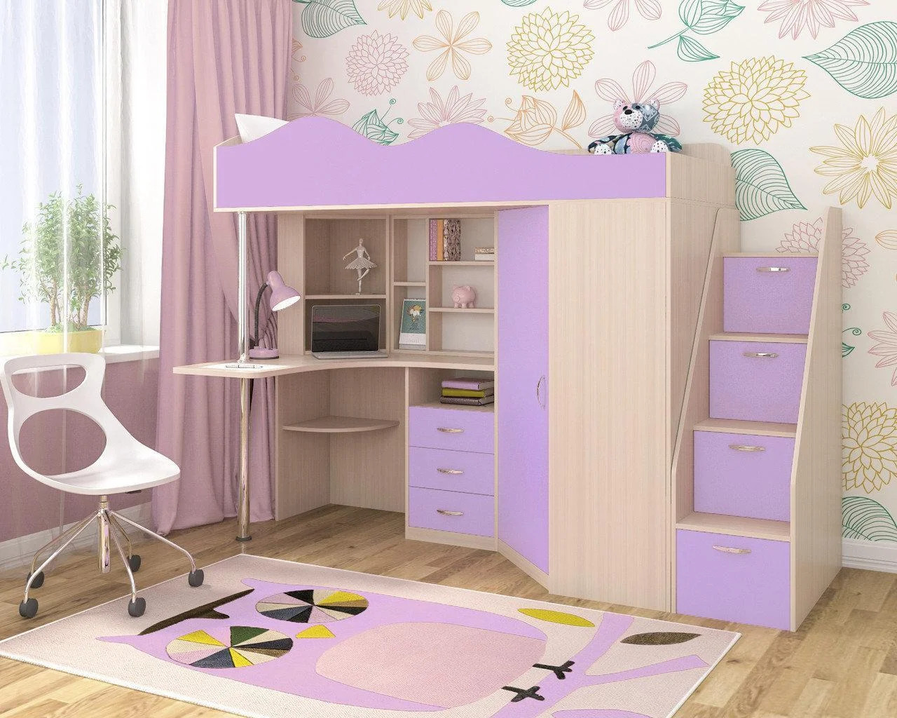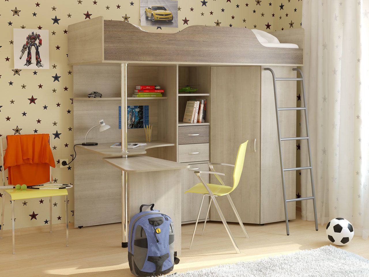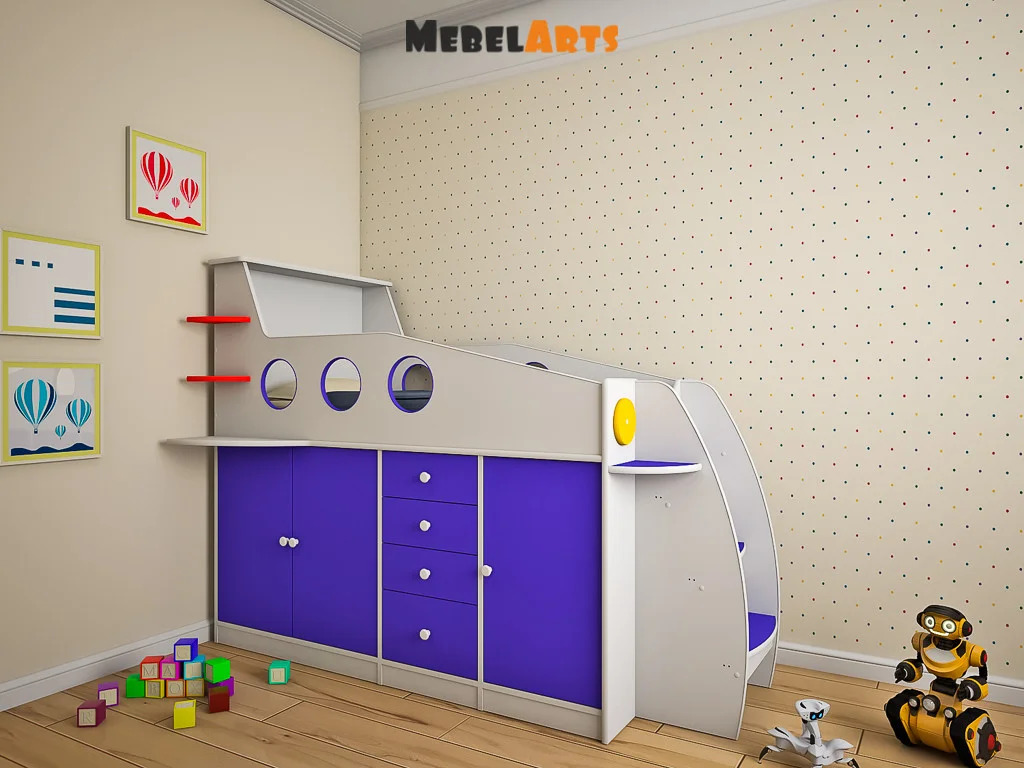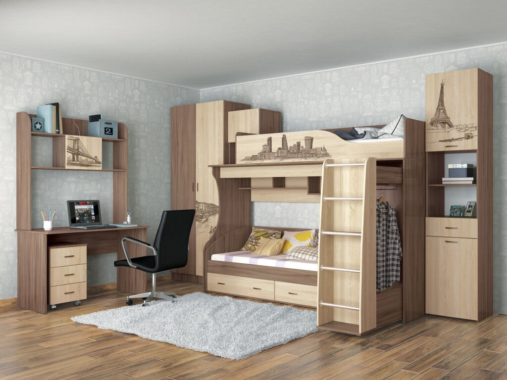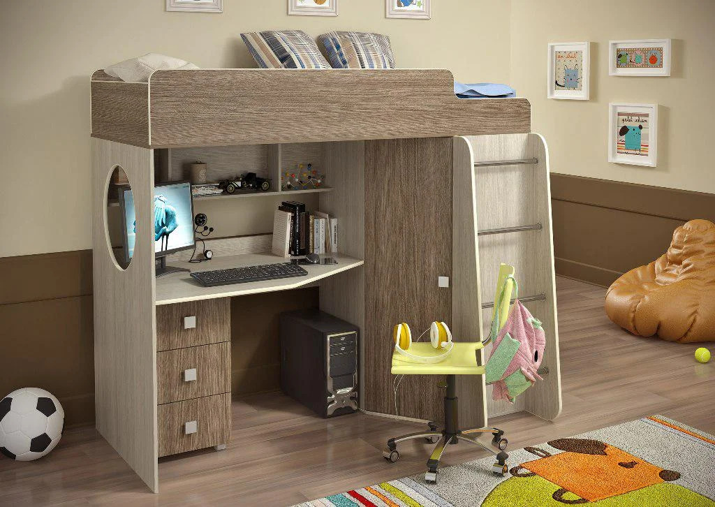- Avec penderie et table. Cet ensemble de meubles n'a pas de premier niveau standard. Au lieu de cela, une zone de travail est organisée ici. Il offre suffisamment d'espace libre pour un ordinateur personnel, de la littérature, divers ustensiles d'écriture et d'autres choses nécessaires.