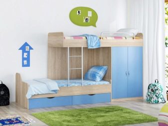 - Lit double avec penderie. Il y a deux options pour cette configuration. Il peut y avoir une couchette plus large ici, ou il peut y avoir 2 lits installés l'un sous l'autre (ou à un angle l'un par rapport à l'autre). Les cas dans lesquels un lit de couchage spacieux est fixé peuvent être achetés non seulement pour les enfants, mais également pour les utilisateurs adultes.