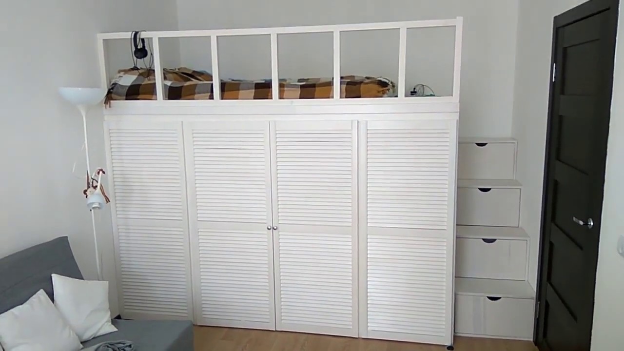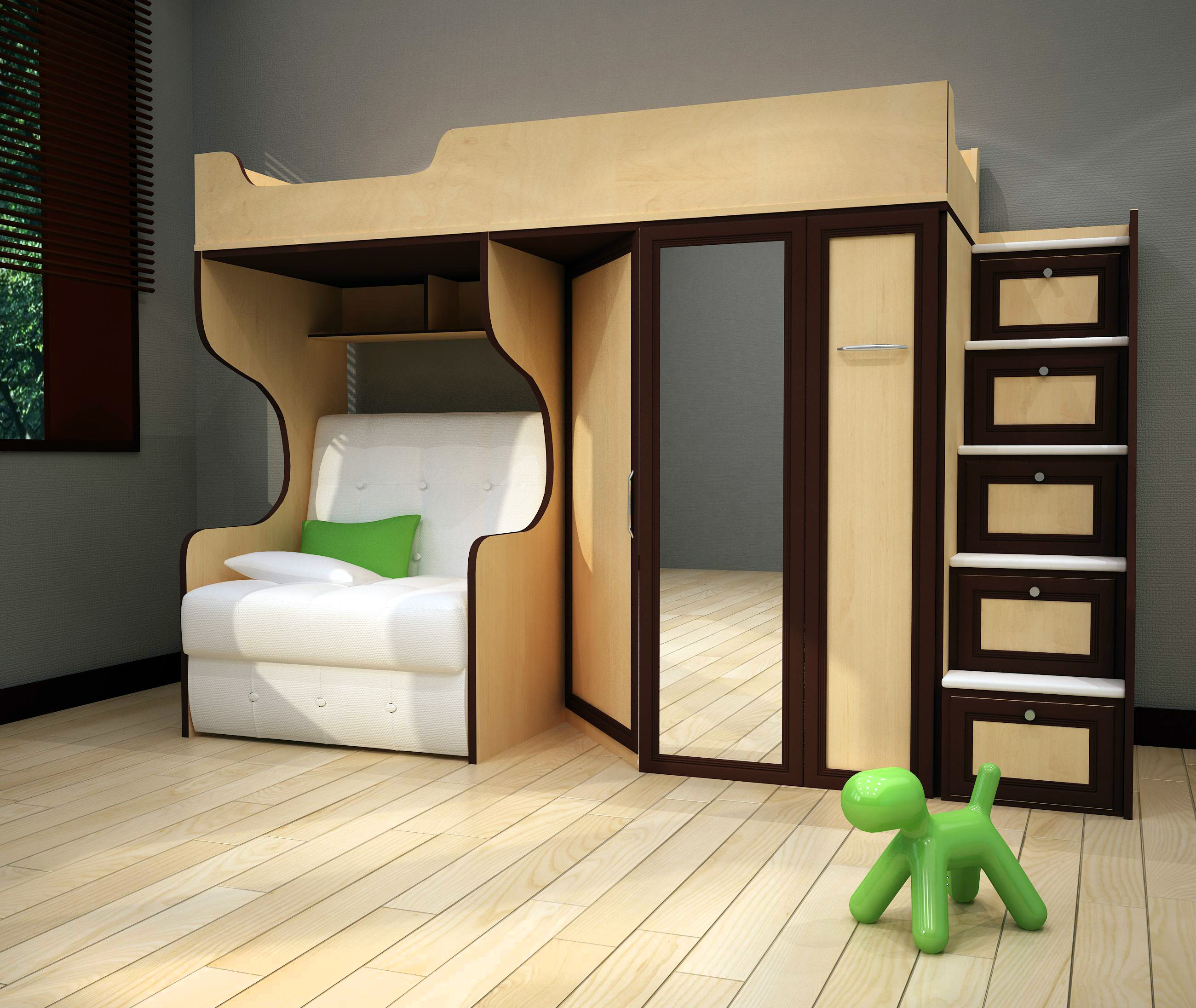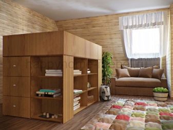 - Le lit mezzanine avec penderie est ergonomique et de taille moyenne, grâce à quoi les propriétaires peuvent économiser considérablement de l'espace dans la pièce.