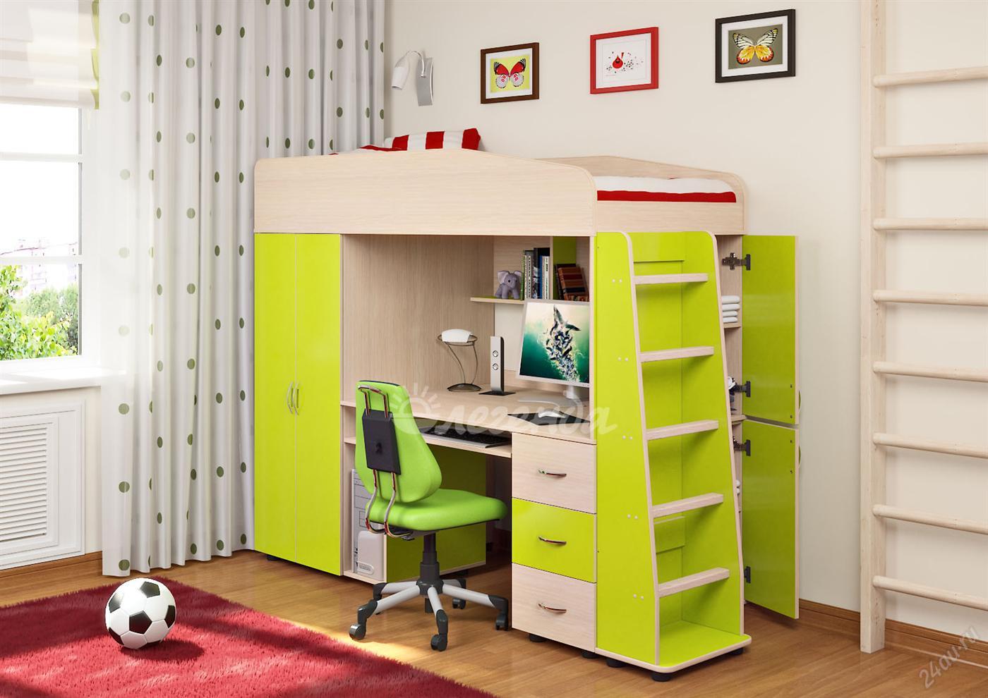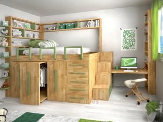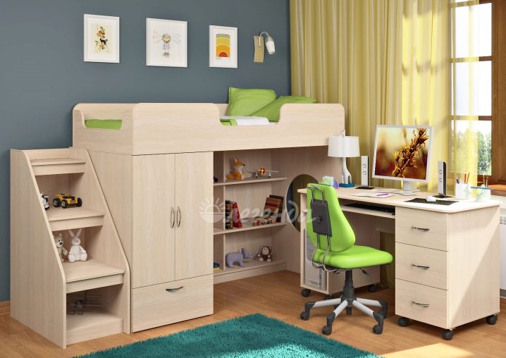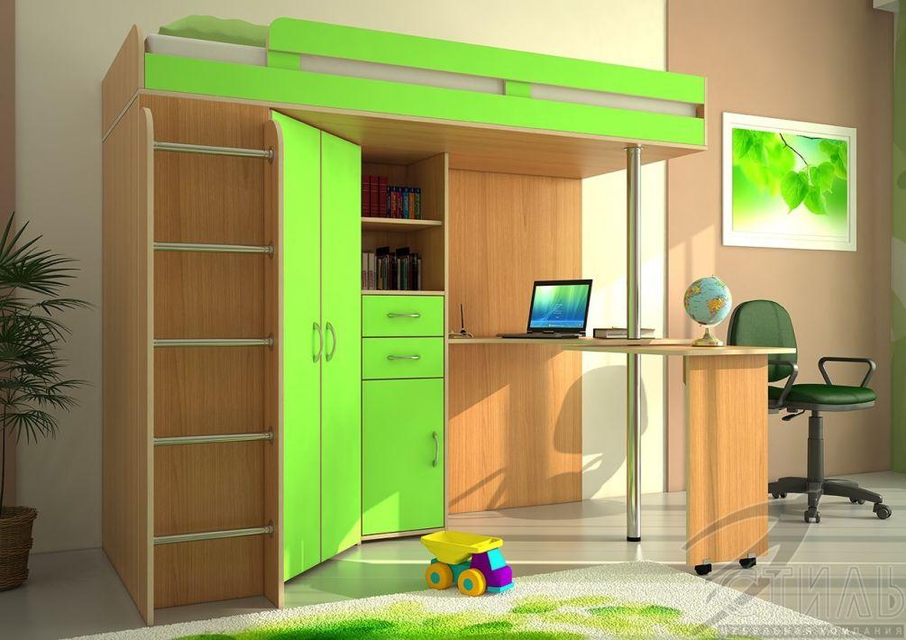 Dans une chambre d'enfant lumineuse, il sera possible de placer un beau lit mezzanine avec une armoire, réalisé dans une combinaison de tons crème et vert juteux. Dans la variante considérée, il y a une échelle, et la partie inférieure est réservée à un meuble et une table pour un PC.