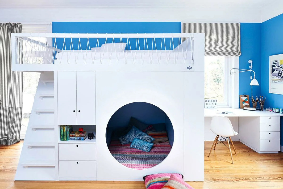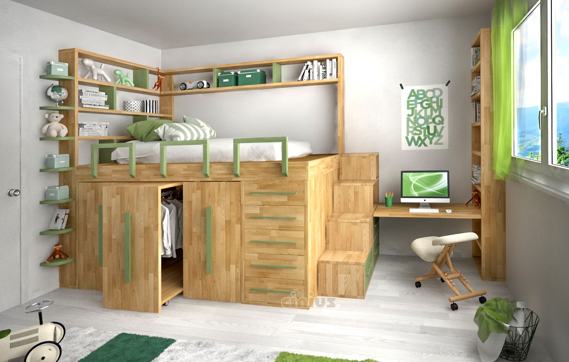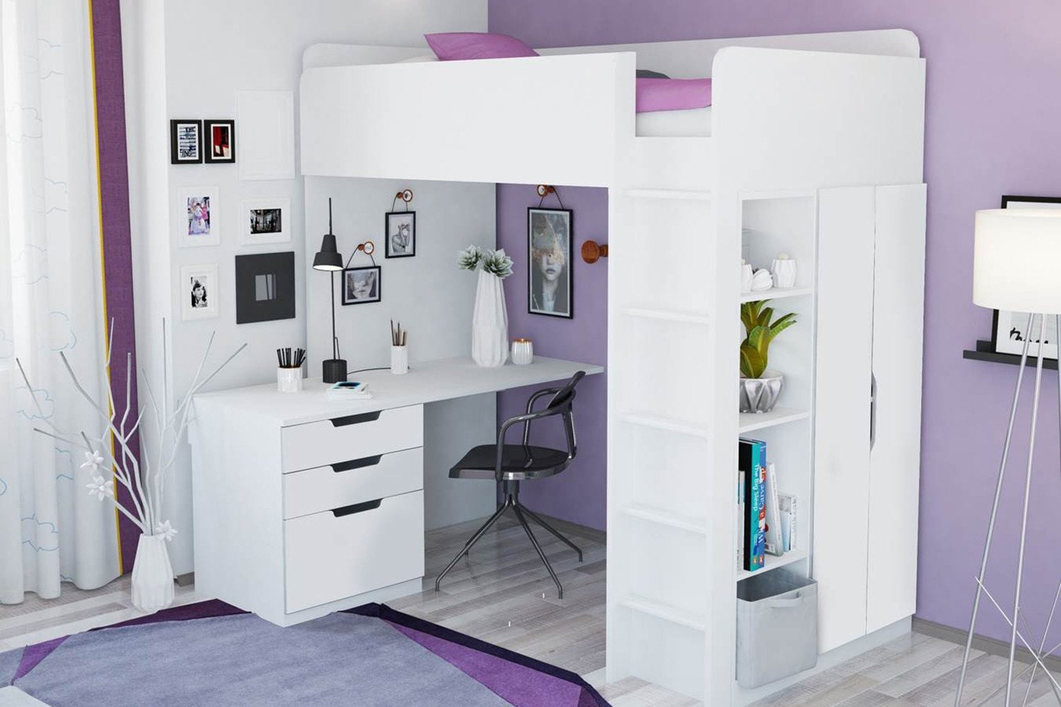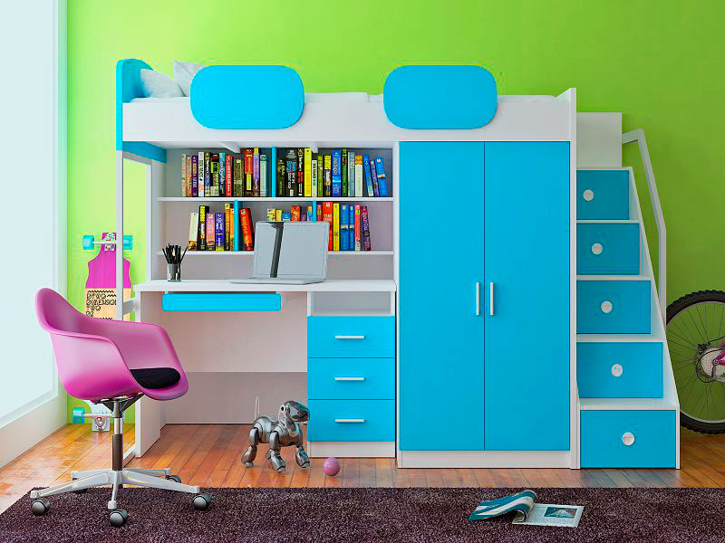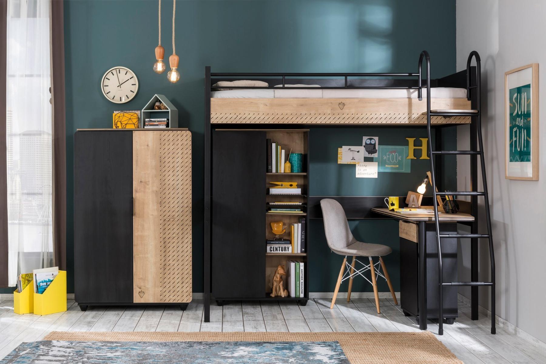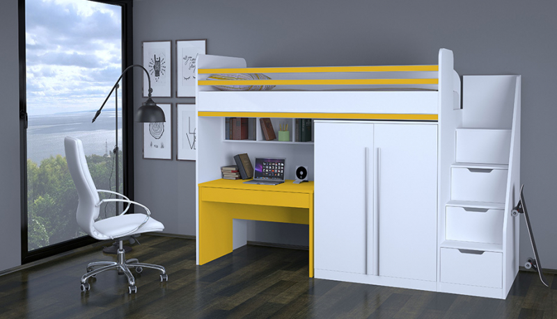 Souvent, les lits mezzanine sont complétés par d'autres composants utiles, par exemple : des tables, des étagères, des étagères, etc.