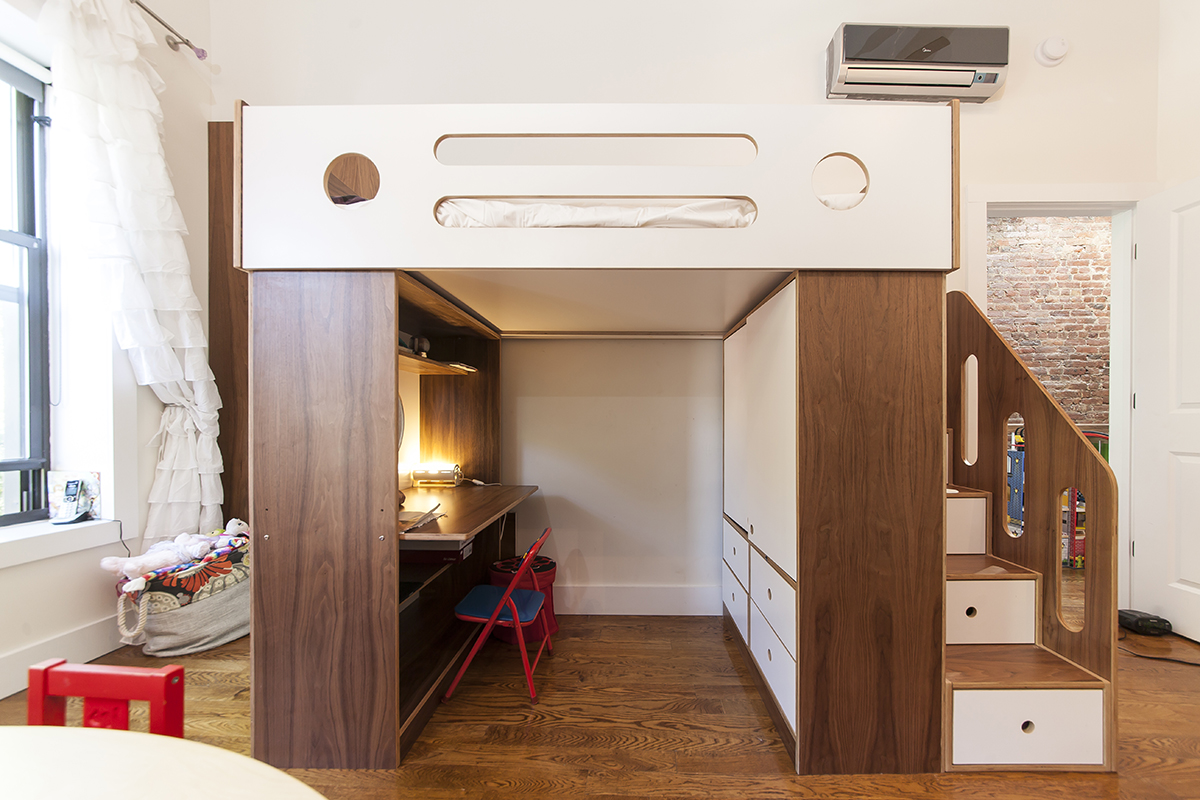 Dans cette conception, les armoires pour vêtements et articles divers sont généralement situées sur le côté ou directement sous la couchette.