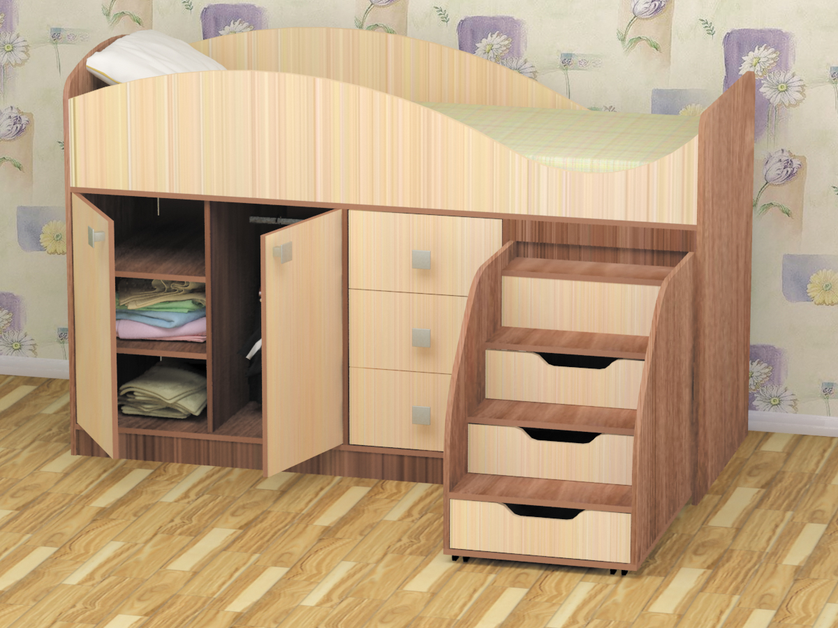 - Matériel. Un lit mezzanine avec une armoire doit nécessairement être fabriqué dans des matériaux respectueux de l'environnement et sûrs, sans prétention, attrayants et aussi fiables que possible.