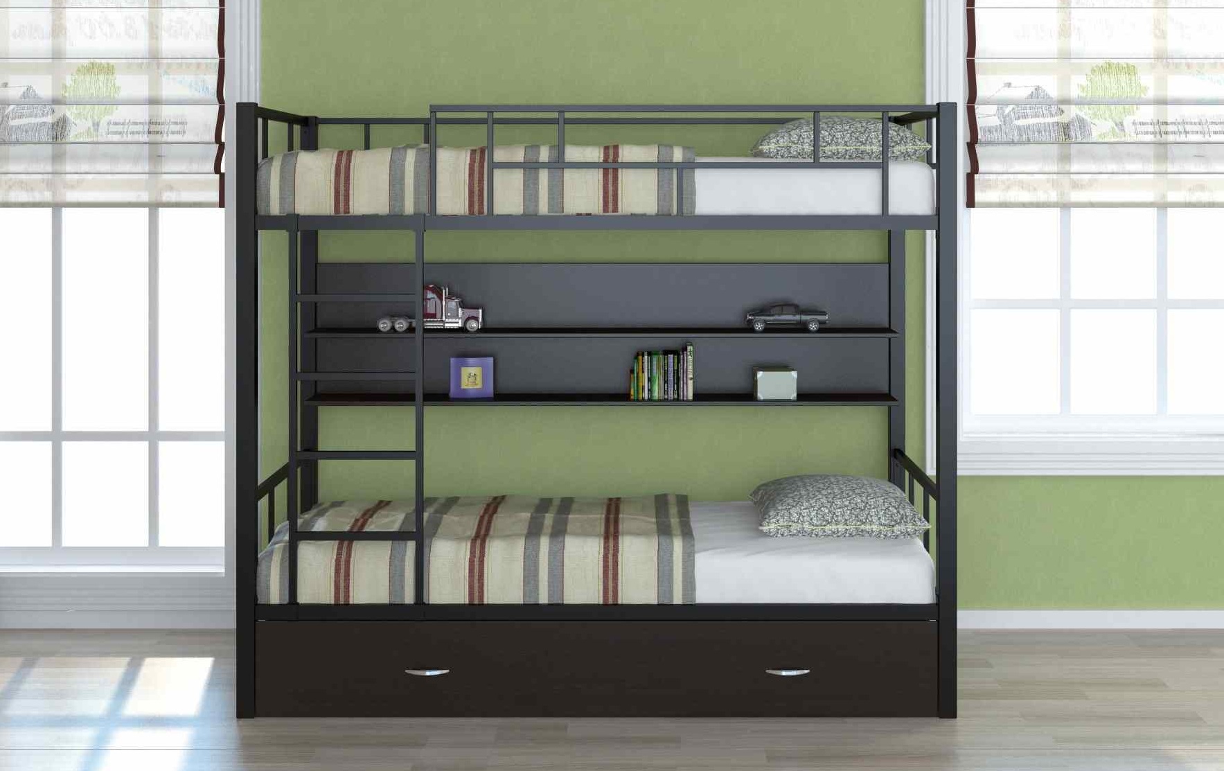 Un lit classique à deux niveaux avec deux zones de couchage convient aux enfants à l'ancienne ou aux jumeaux. Et il deviendra aussi une solution pratique dans une famille nombreuse, un camp d'enfants ou une auberge.