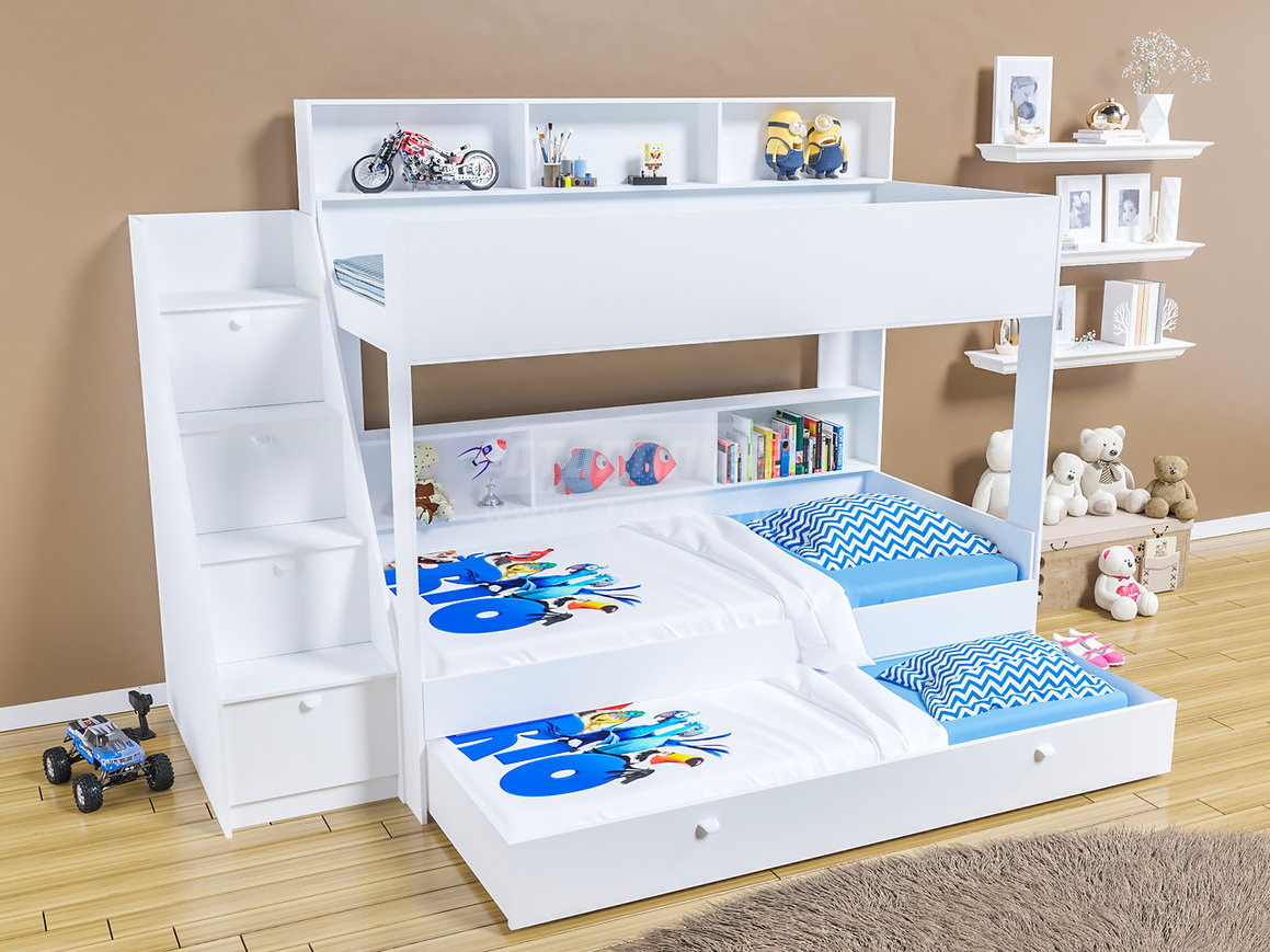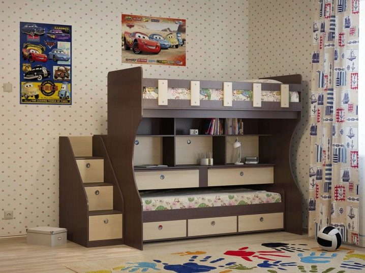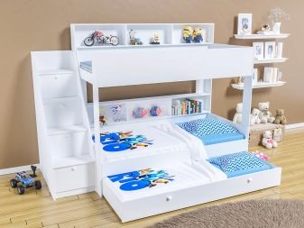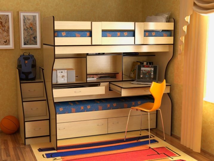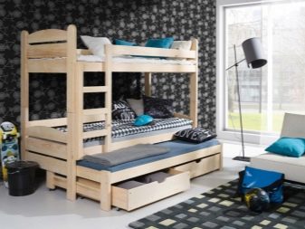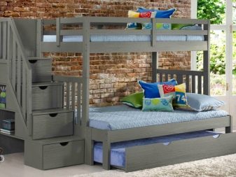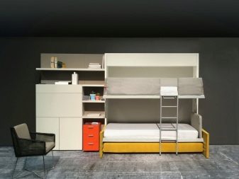 Pour les familles nombreuses, il existe des options triples. Habituellement, au premier étage, il y a deux couchettes ou un grand lit pour deux et un au-dessus. Pour les chambres, des meubles avec un mécanisme rétractable sont souvent choisis, lorsqu'un coin salon supplémentaire se déploie sous le principal. Vous pouvez souvent trouver des lits pliants qui s'ouvrent comme un livre.