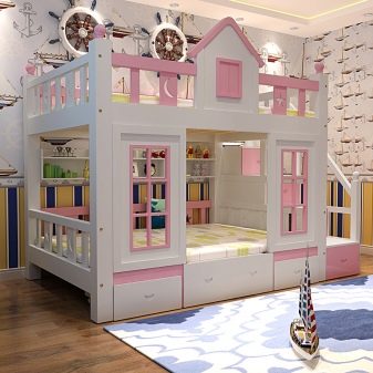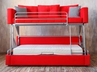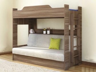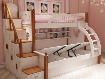 En plus de l'objectif évident, ces meubles peuvent avoir des boîtes de rangement intégrées, un éclairage du niveau inférieur ou un plateau de table pliant. Certains modèles ont une couchette à l'étage et une table de travail complète en dessous. Dans ce cas, les parois latérales sont des racks ou des armoires.
