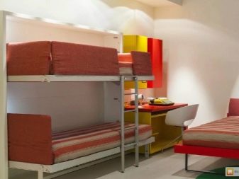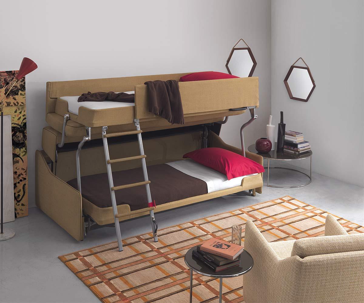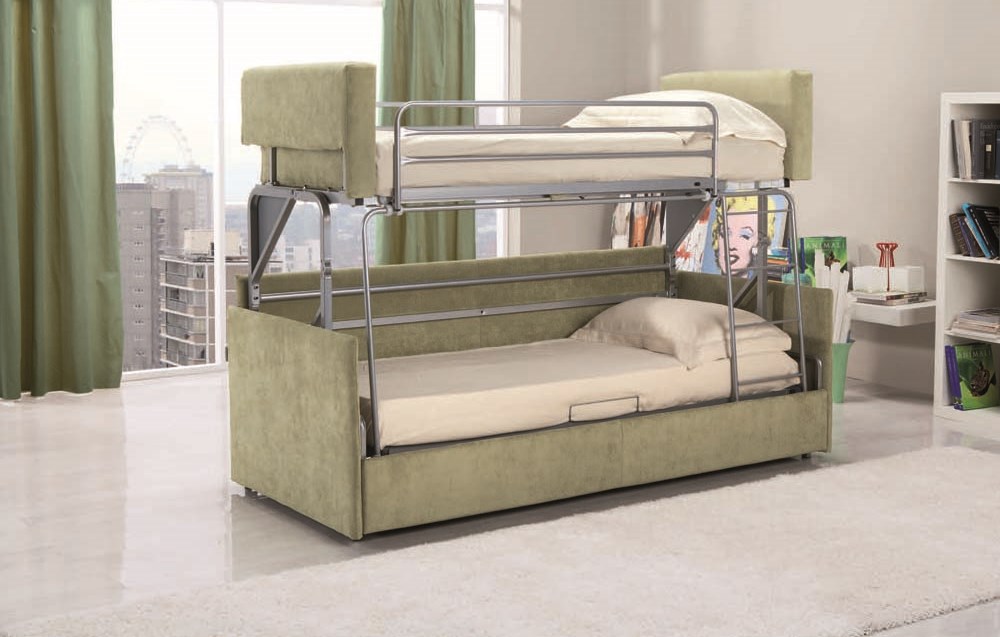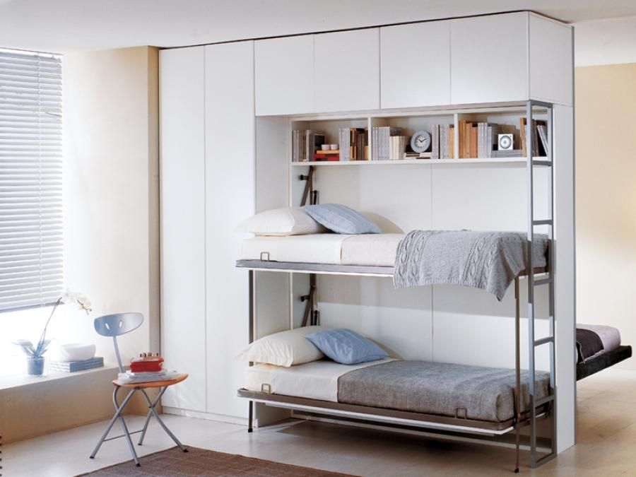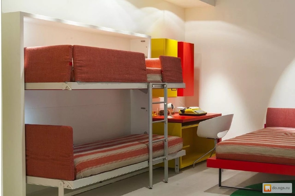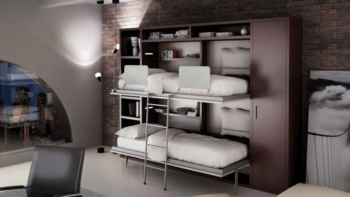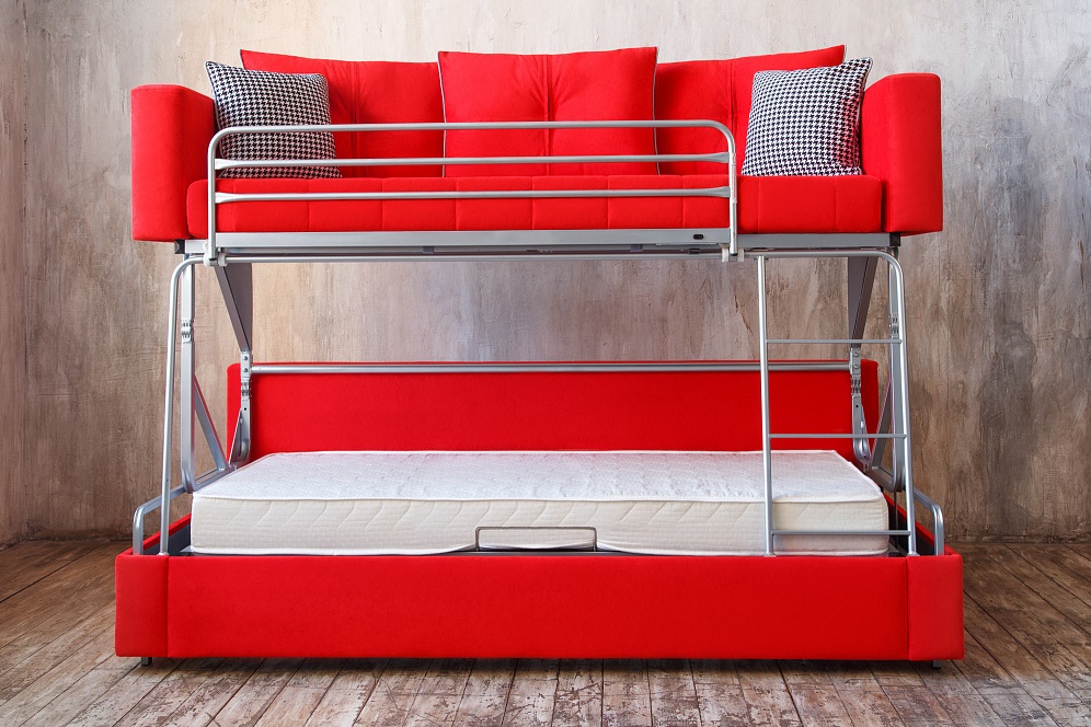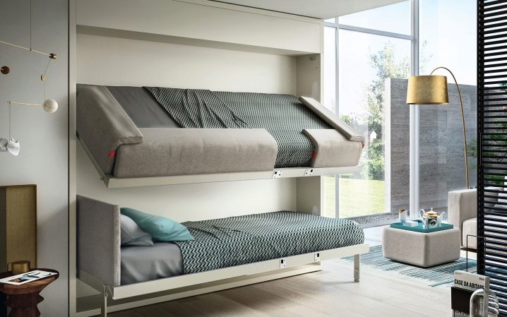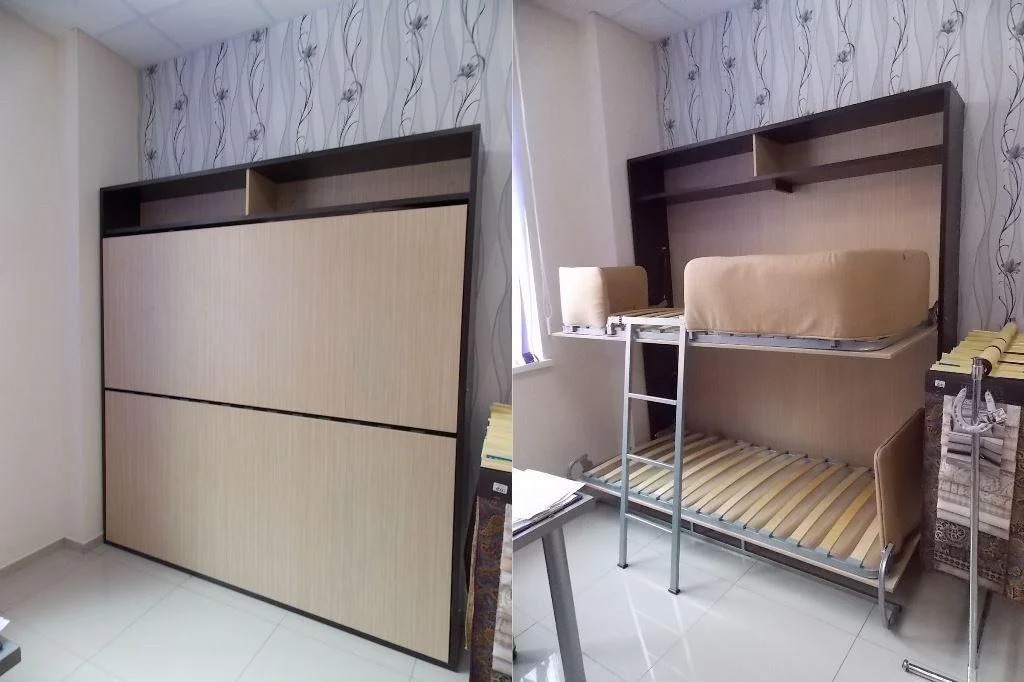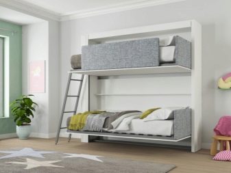 Si vous n'utilisez pas d'éléments supplémentaires tout le temps, examinez de plus près les lits superposés pliants. La partie inférieure peut être convertie en canapé pour la détente, ou, en alternative, le niveau supérieur peut être rangé fixé au mur.