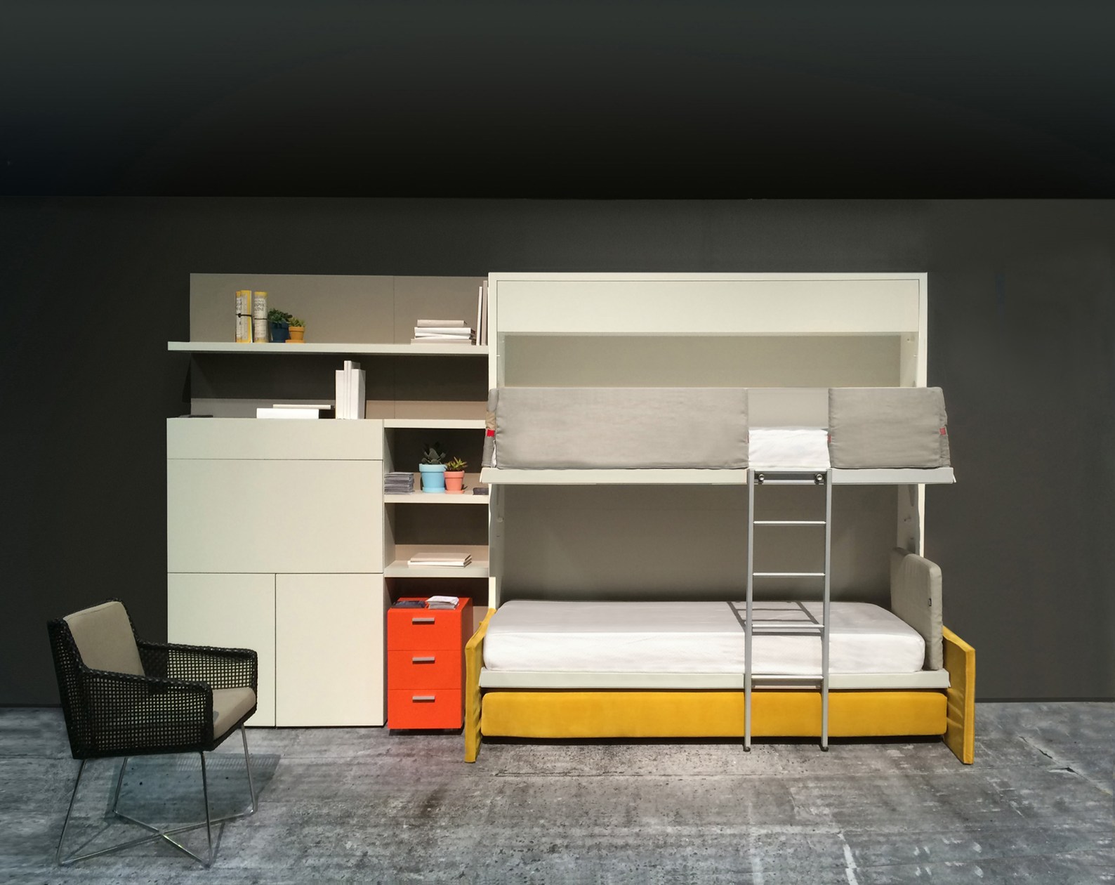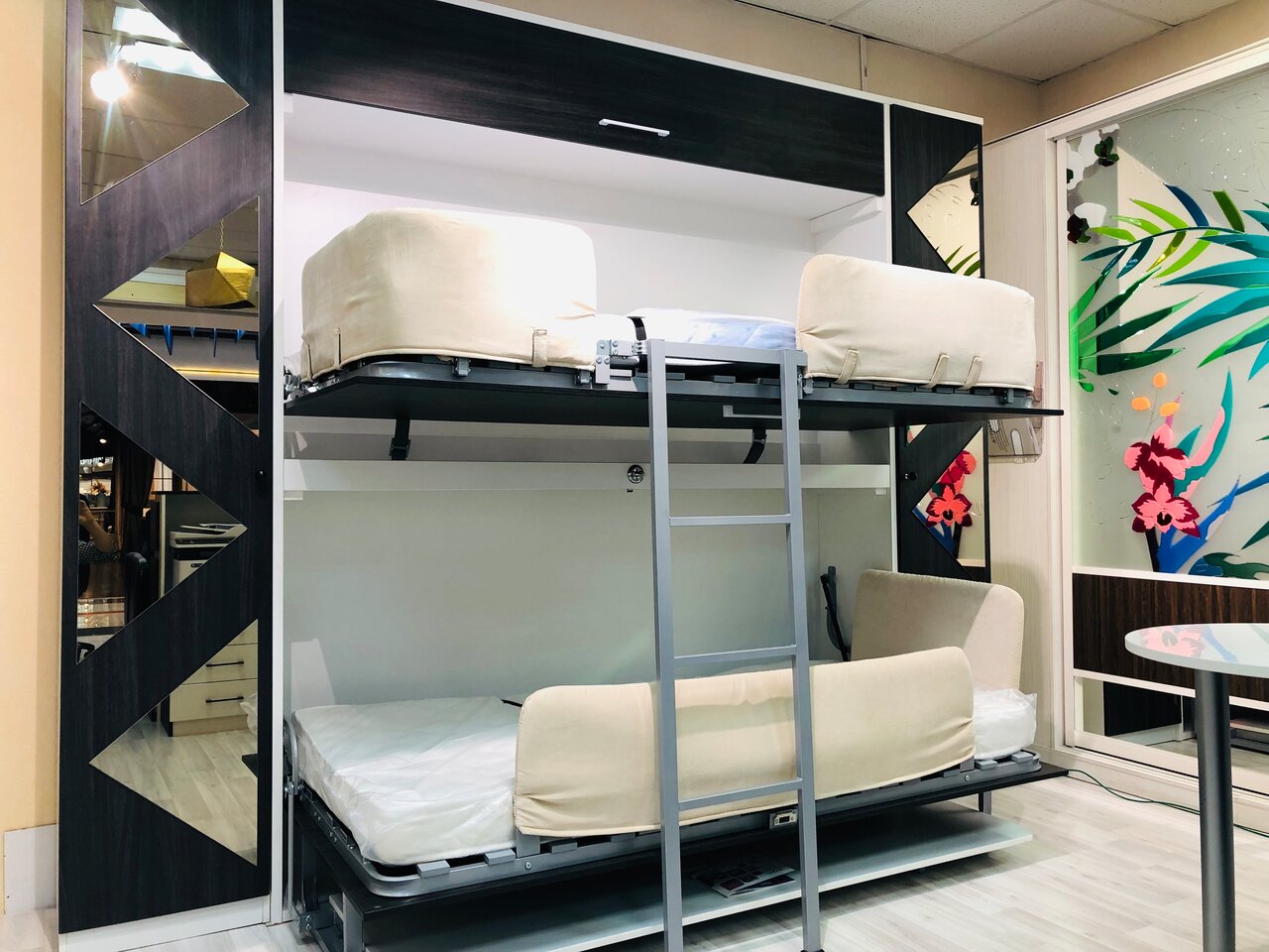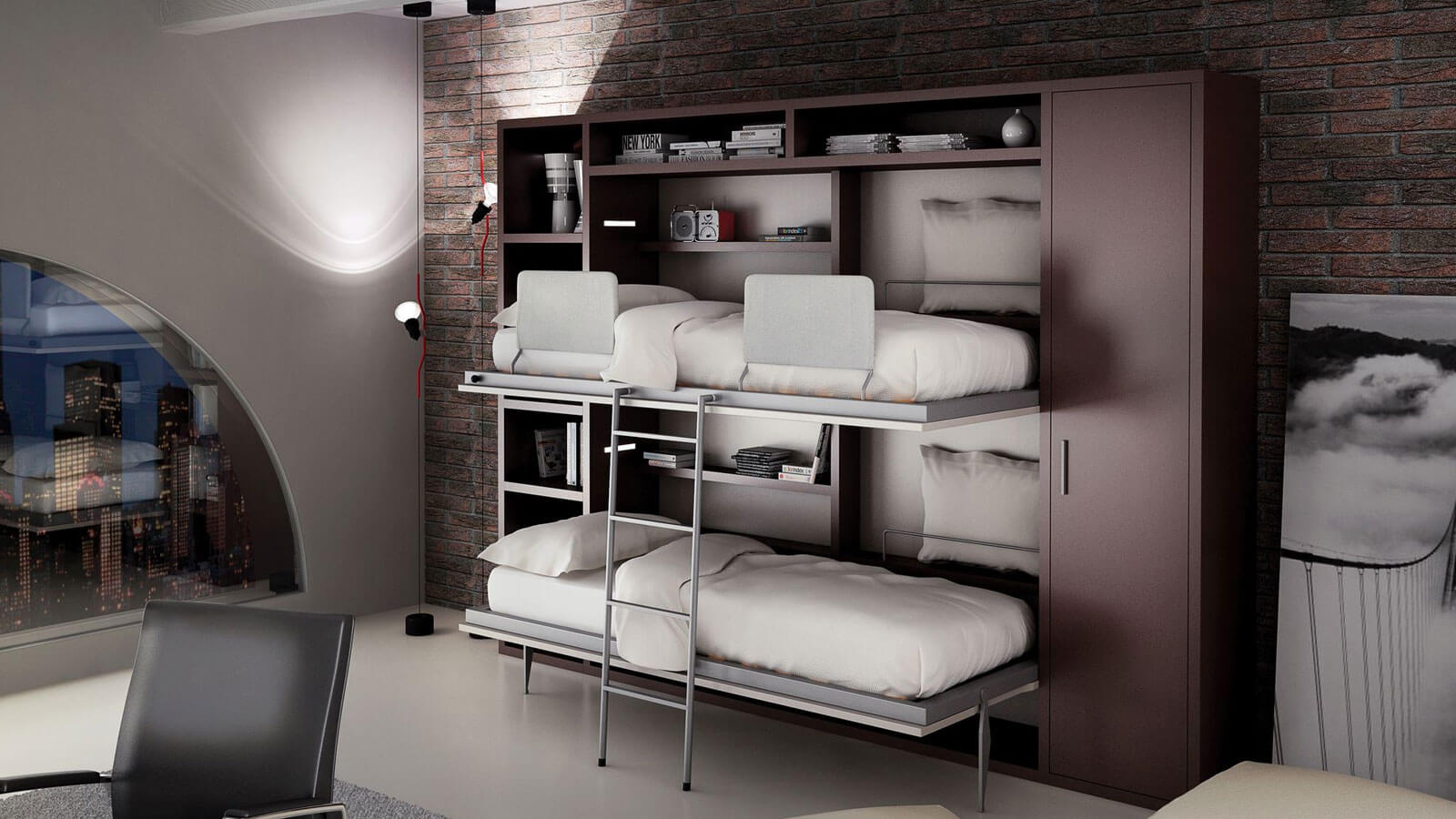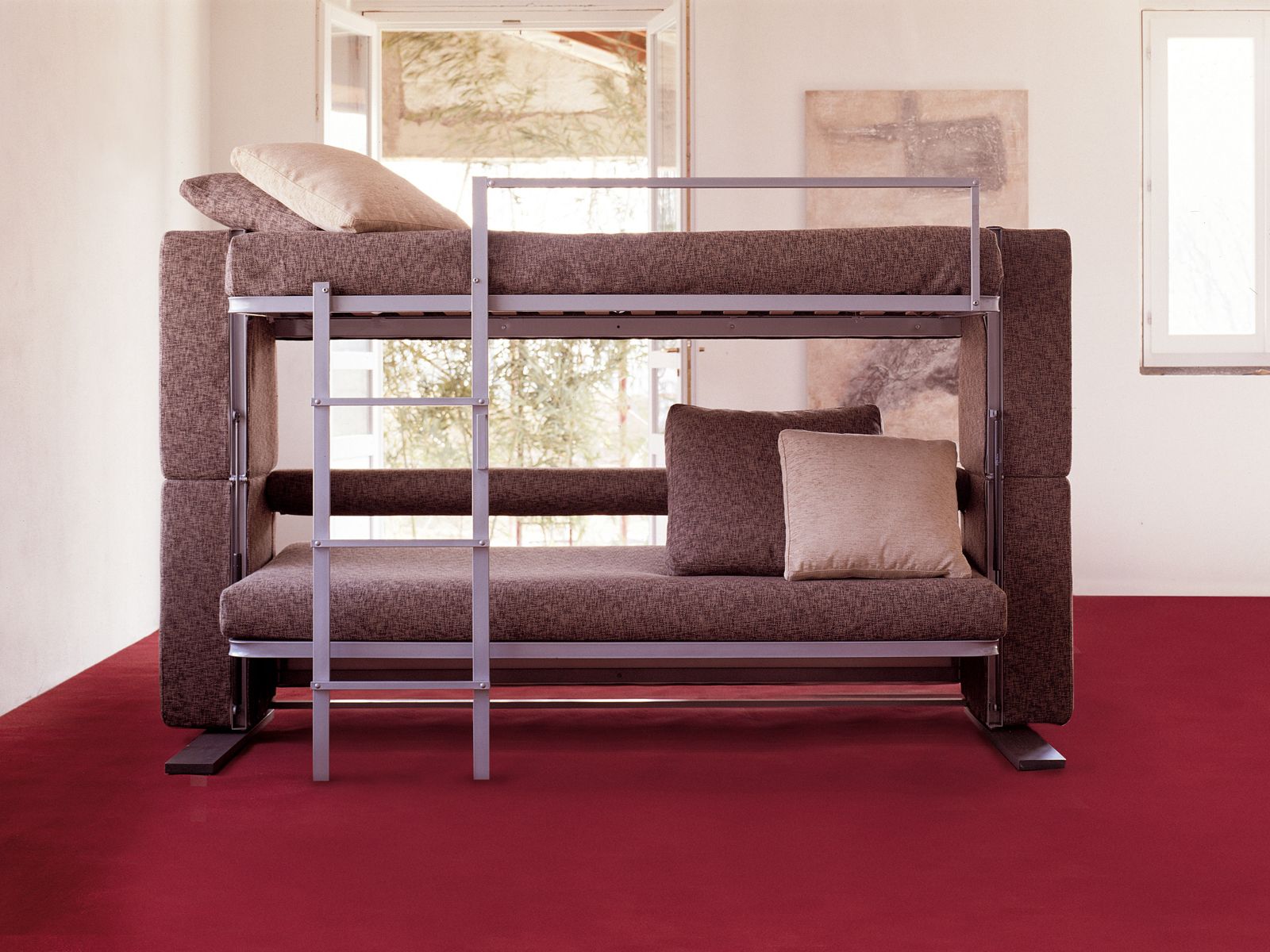 Si vous n'utilisez pas d'éléments supplémentaires tout le temps, examinez de plus près les lits superposés pliants. La partie inférieure peut être convertie en canapé pour la détente, ou, en alternative, le niveau supérieur peut être rangé fixé au mur.