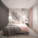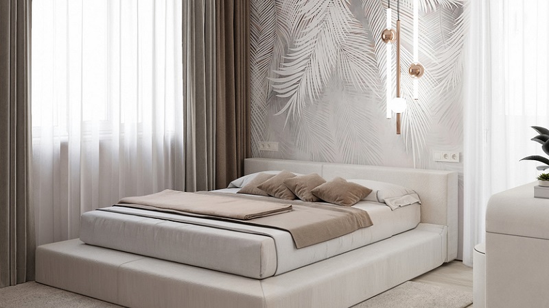 Pour la chambre à coucher, du papier peint avec des plumes dans un ton sobre, des combinaisons de couleurs calmes sont bonnes. En même temps, ils sont appelés à ajouter un certain zeste au design du boudoir. Dans la tendance, la combinaison de papier peint avec un imprimé et des toiles unies est complètement sans motif.