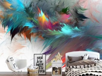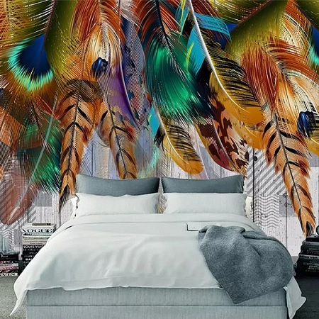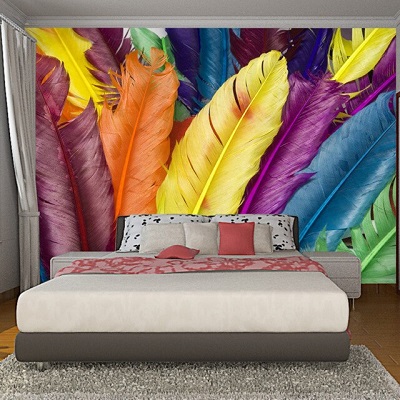 - Les plumes multicolores recréées dans une fresque grand format en couleurs séduisent par leur originalité et complètent le design créatif. Un tel décor n'est pas rare dans les chambres Art Déco, kitsch, fusion et bohème.
