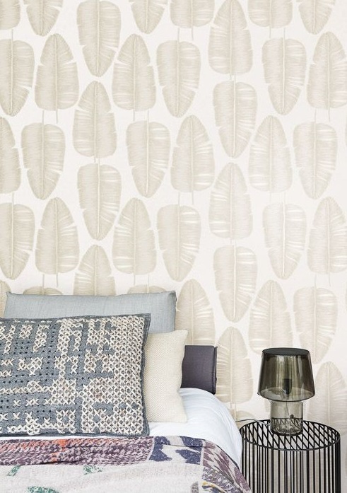 Par exemple, le mur à la tête est recouvert de papier peint à grosses plumes et un papier peint compagnon monochrome est collé sur le mur opposé et adjacent.