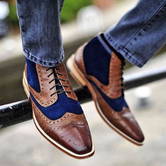 - Chaussures homme bicolores associées à un jean. Les couleurs contrastent les unes avec les autres et se complètent en même temps.